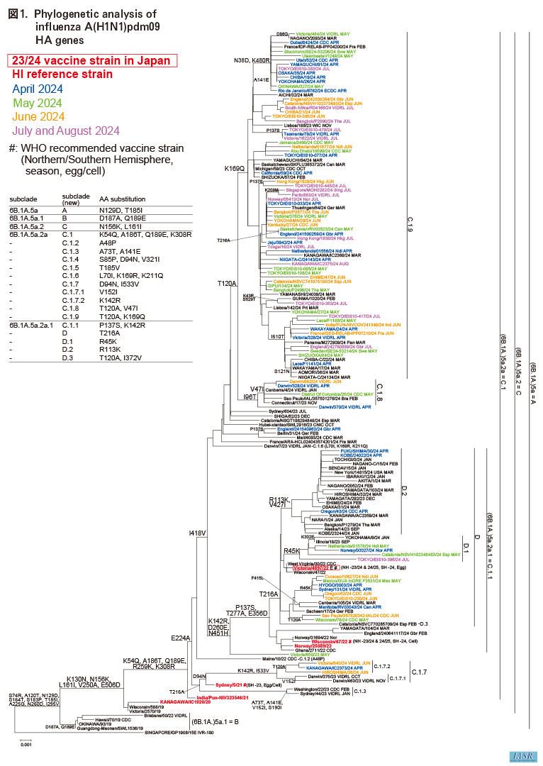 臨床検体を含む国内294株および海外(韓国、 モンゴル、 ラオス)34株について解析を実施した。最近の流行株はクレード6B.1A.5a.2a(略名: 5a.2a=新クレード名C.1)(K54Q、 A186T、 Q189E、 K308R)に属している。C.1(5a.2a)内には、 クレード5a.2a.1(P137S、 K142R)(=C.1.1)(代表株A/Wisconsin/67/2022)、 C.1.7(D94N、 I533V)、 C.1.7.2(K142R)、 C.1.8(V47I、 T120A)、 C.1.9(T120A、 K169Q)などが派生している。またC.1.1(5a.2a.1)内にはサブクレードD(T216A)(代表株A/Victoria/4897/2022)、 D.1(R45K)、 D.2(R113K)などが派生しており、 世界的にはD、 D.1、 D.2、 C.1.8、 C.1.9が主流となっている。解析した国内株の61.9%が5a.2a.1に、 38.1%が5a.2aに属した。新(サブ)クレードの分類では、 D.2(49.3%)、 C.1.9(26.9%)、 C.1.7.2(5.8%)、 D.1(5.4%)、 C.1.1(5.4%)、 C.1(4.4%)などであった。