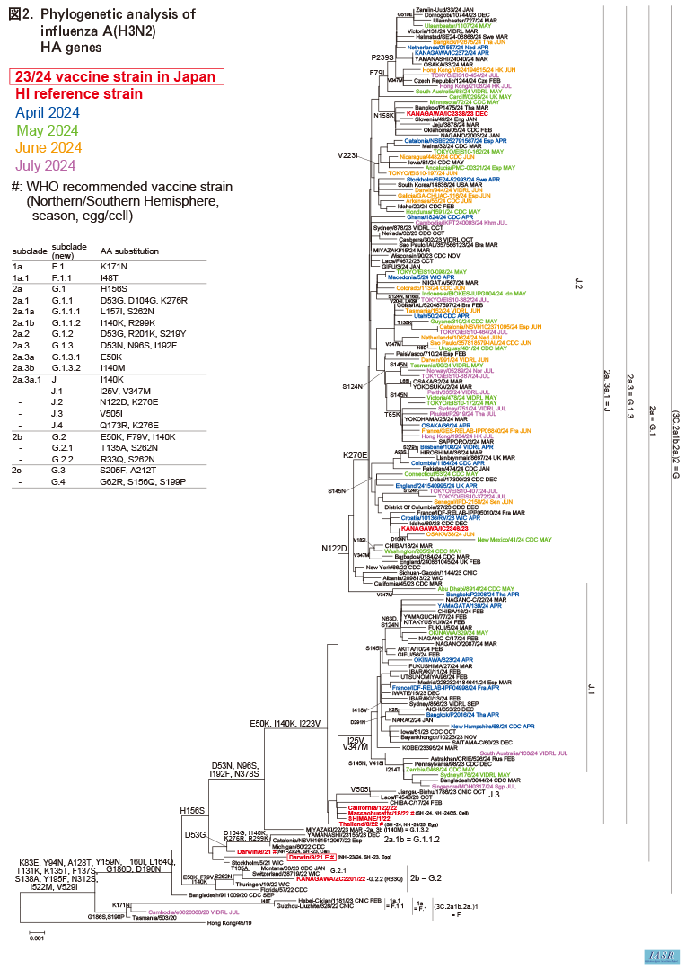 国内334株および臨床検体を含む海外(韓国、 ミャンマー、 モンゴル、 ラオス)43株について解析を実施した。最近の流行株は、 HA遺伝子系統樹上のクレード3C.2a1b.2a.2(Y159N、 T160I、 L164Q、 G186D、 D190N)(略名: クレード2=新クレード名G)に属している。クレード2内ではさらに2a(H156S)(=G.1)(代表株A/Darwin/9/2021)、 2b(E50K、 F79V、 I140K)(=G.2)に分岐している。2a内には現在、 2a.1b(I140K、 R299K)(=G.1.1.2)、 2a.3a.1(I140K)(=J)(代表株A/Thailand/8/2022)などが分岐している。2a.3a.1(J)にはさらに、 J.1(I25V、 V347M)、 J.2(N122D、 K276E)、 J.3(V505I)などが派生しており、 世界的には2a.3a.1(J)内のJ.1およびJ.2が主流である。国内株はすべてクレード2に属し、 96.7%が2a.3a.1であり、 他に2a.1b、 2bも検出された。新(サブ)クレードの分類では、 J.1(66.8%)、 J.2(18.0%)、 G.2.1(1.6%)、 G.1.1.2(1.3%)、 J(0.8%)であった。
