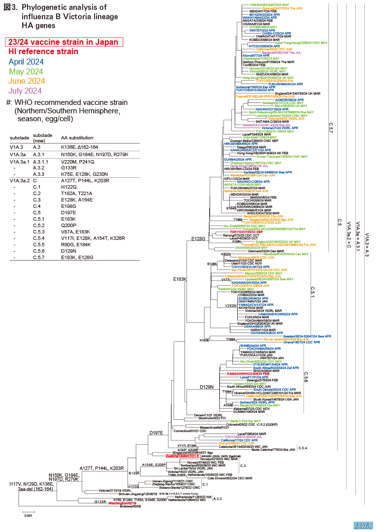 国内200株および臨床検体を含む海外(韓国、 モンゴル、 ミャンマー、 ラオス)26株について解析を行った。近年のウイルスは、 成熟HAに3アミノ酸欠損をもつクレードV1A.3(162-164アミノ酸欠損、 K136E)(新クレード名A.3)内のV1A.3a.2(略名: 3a.2=C)(A127T、 P144L、 K203R)(代表株B/Austria/1359417/2021)に属している。C内にはC.1(H122Q)、 C.3(E128K、 A154E)、 C.5(D197E)などが派生しており、 C.5にはさらにC.5.1(E183K)、 C.5.6(D129N)、 C.5.7(E183K、 E128G)などが派生している。世界的にはC内のC.5.1、 C.5.6、 C.5.7が主流である。国内株はC.5.7(46.0%)、 C.5.1(23.9%)、 C.5.6(11.9%)、 C.5(6.2%)であった。