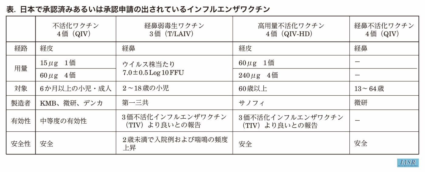 インフルエンザは、オルソミクソウイルス科に属するインフルエンザウイルス、特にA型とB型のヒトへの感染により、主に冬季に流行する急性呼吸器感染症である。多くの感染者は軽症だが、若年小児や高齢者では重症化することがある。米国では高齢者の入院、死亡の最多要因となるなど、インフルエンザは、社会・医療・経済への影響が大きい1)。インフルエンザウイルスの主要表面抗原タンパク、ヘマグルチニン(HA)とノイラミニダーゼ(NA)が持続的に変化を起こすため(抗原ドリフト)、常に感受性者が存在し、毎年世界の全人口の3-18%が感染するとされる1,2)。またインフルエンザウイルスは、これまでヒトに感染性・伝播性がなかったHAとNAの組み合わせを持つウイルスがこれらの性状を持った場合(抗原シフト)、世界的な大流行を引き起こすことがある。このため、インフルエンザのサーベイランスと有効なワクチン戦略は、公衆衛生上重要である。季節性インフルエンザワクチンとして、日本国内では、不活化ワクチンの「インフルエンザHAワクチン」と経鼻弱毒生ワクチンの「フルミスト®点鼻液」が薬事承認済みであり、現在、高用量インフルエンザワクチン4価および経鼻不活化ワクチンの薬事承認申請が提出されている3-6)(表)。