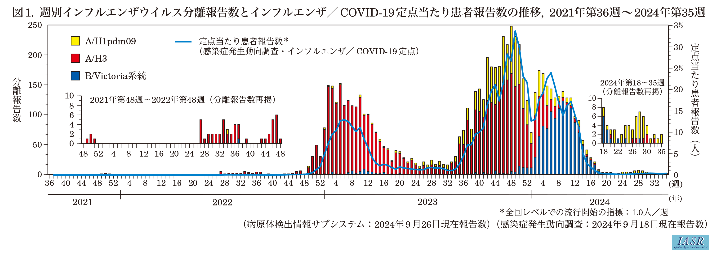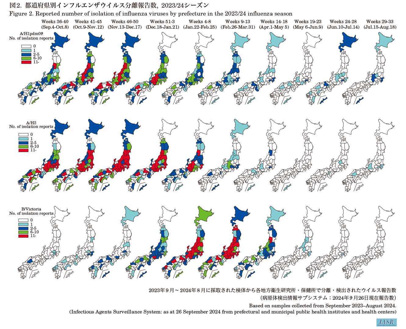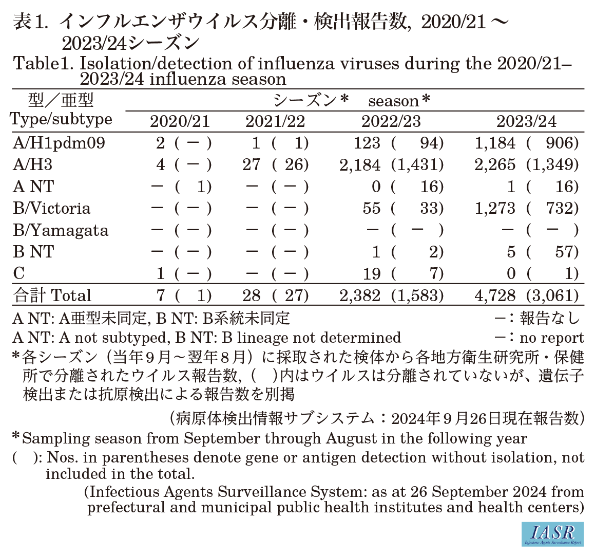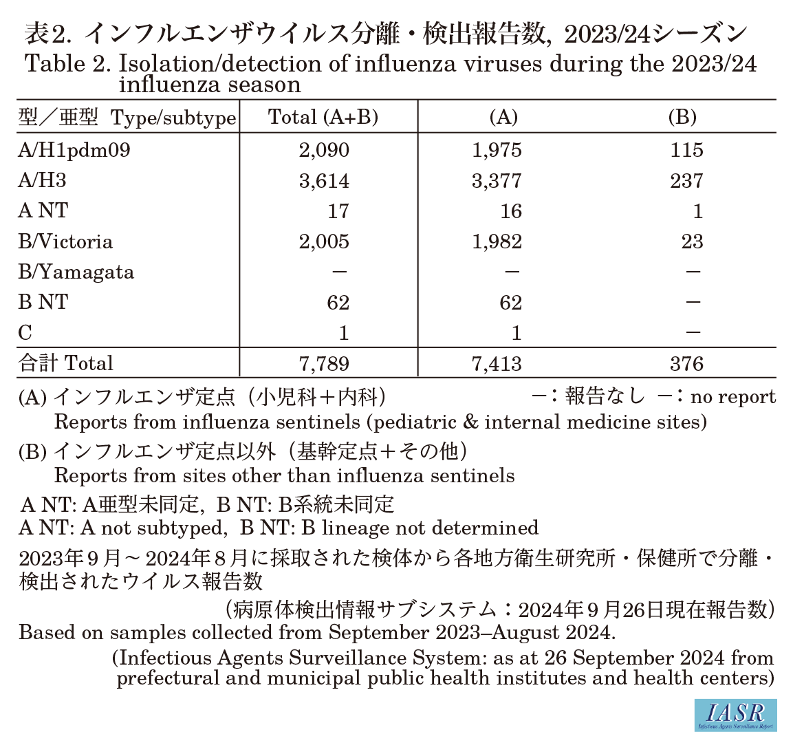 2023/24シーズンウイルス分離・検出状況(2024年9月26日現在): 全国の地方衛生研究所・保健所が分離・検出し、 インフルエンザ病原体サーベイランスに報告したインフルエンザウイルス数は7,789(分離4,728、 検出のみ3,061)(表1)、 うちインフルエンザ定点で採取された検体からの分離・検出数は7,413、 定点以外の検体からの分離・検出数は376であった(表2)。型・亜型別ではA/H1pdm09亜型が2,090株、 A/H3亜型が3,614株(A亜型不明は17株)で、 B/Victoria系統が2,005株、 B/山形系統の報告はなかった(B型系統不明は62株)。2024年初め頃まではA/H3亜型とA/H1pdm09亜型が流行していた(A/H3>A/H1pdm09)が、 それ以降はB/Victoria系統の報告数が増えた(図1および図2)。