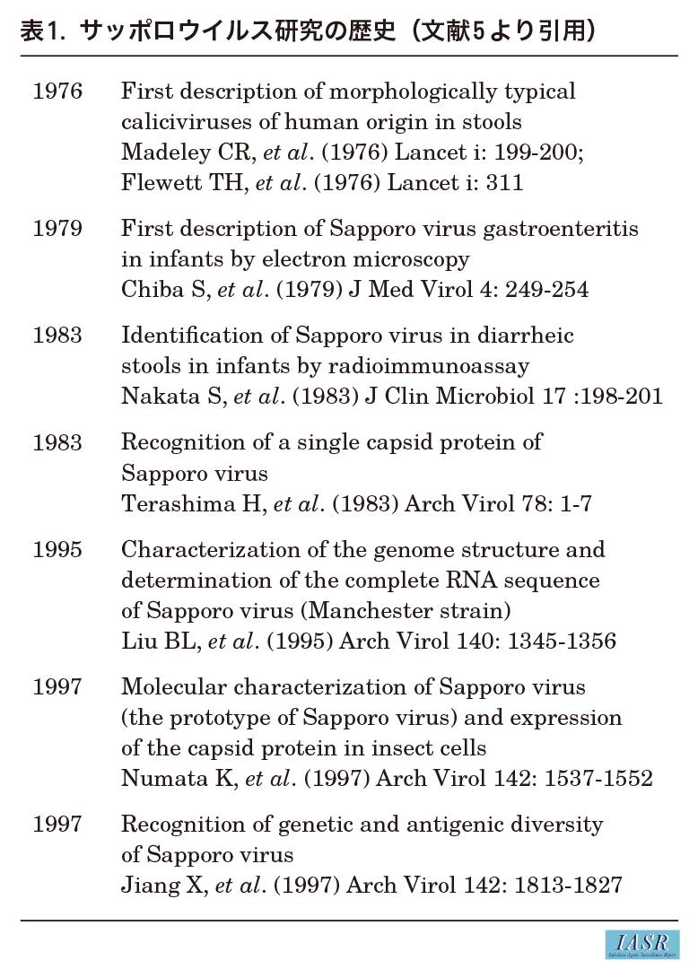 その後、ノルウェー、カナダ、英国、日本の急性胃腸炎散発例、入院例や集団発生例から同様なウイルス粒子の検出が報告された3)。Chibaらは、1977年に札幌市の乳児院においてみられたヒトcalicivirus(現在のサッポロウイルス)による急性胃腸炎集団発生を解析し、1979年に報告している(表1)。引き続き行われた様々な研究によってヒトcalicivirus(現在のSaV)は胃腸炎ウイルスの1つとして確立された3,6)。しかし、試験管内培養法が確立できなかったため、本ウイルスの入手は容易ではなく、1980~1990年代までの研究は主に日本の札幌医科大学と英国、一部米国に限られていた1-3)。1977~1982年にかけて、札幌市の乳児院において4回のヒトcalicivirus胃腸炎の集団発生がみられ、札幌医科大学ではそれら抗原性が同じ一連のウイルス(SaVのプロトタイプSaV/G1.1注1/Sapporo/1982/JP)を材料とすることで、以下に述べるように多くの研究を行うことができた。