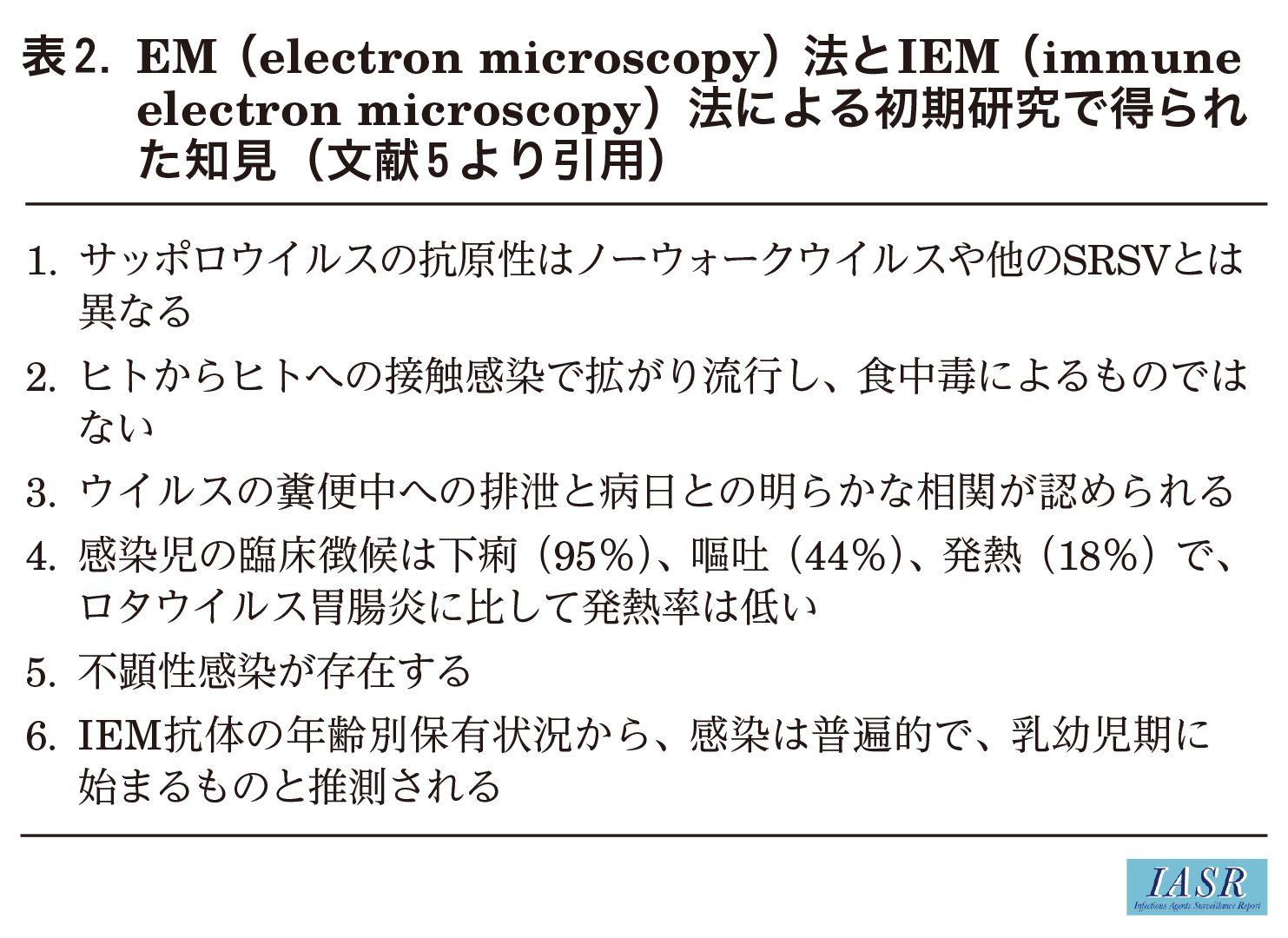 まず、EM法、免疫EM法を使用した札幌医科大学の初期研究で得られた知見は、後に食中毒と関連する遺伝子型が判明したものの、多くが現在でも通用する基本的なものであった(表2、文献5より引用)(表1、Chiba S、et al.、1979)7,8)。英国のCubittらも抗原性の違い、臨床徴候、不顕性感染の存在、高齢者施設での感染等の報告を行っていた3)。その後、Chibaらは豊富な糞便材料を用いることで、このウイルス粒子は62kDaのsingle capsid proteinを持つというcalicivirusの特徴を確認した(表1)。また、radioimmunoassay (表1)やenzyme immuoassayの開発により、多くの疫学的および免疫学的研究を行い、主に5歳未満の小児にみられる世界的に普遍的な感染症であることを示した2)。