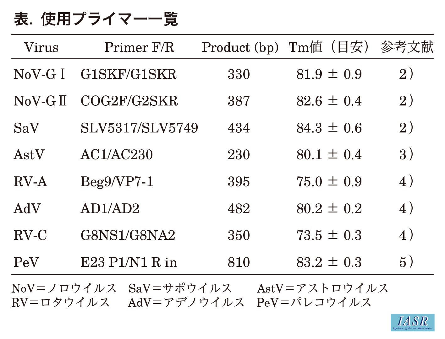 現在、当所の感染性胃腸炎の検査は田澤らの報告1)に準じて、SaV、NoV、AstV、AdV、RVの5種類のウイルス検索を同時に行っており、必要に応じてパレコウイルス(PeV)やエンテロウイルスを追加している。表に当所で使用しているプライマーを示す。反応試薬は非特異反応が比較的少ないTaKaRaバイオ社のTB Green® Fast qPCR MixとQuantstudio real-time PCRシステムを使用し、1時間程度で結果を得ている。インターカレーター法は非特異反応がみられる場合もあるが、融解曲線分析において陽性対照と検体のTm値が近似する場合は、必要に応じてPCR増幅産物を電気泳動し、判断している。PCR陽性の場合は、PCR増幅産物を精製し、シーケンス解析を行い塩基配列を決定する。得られた塩基配列は、系統樹解析またはオンライン解析ツールにより、遺伝子型を判定している。