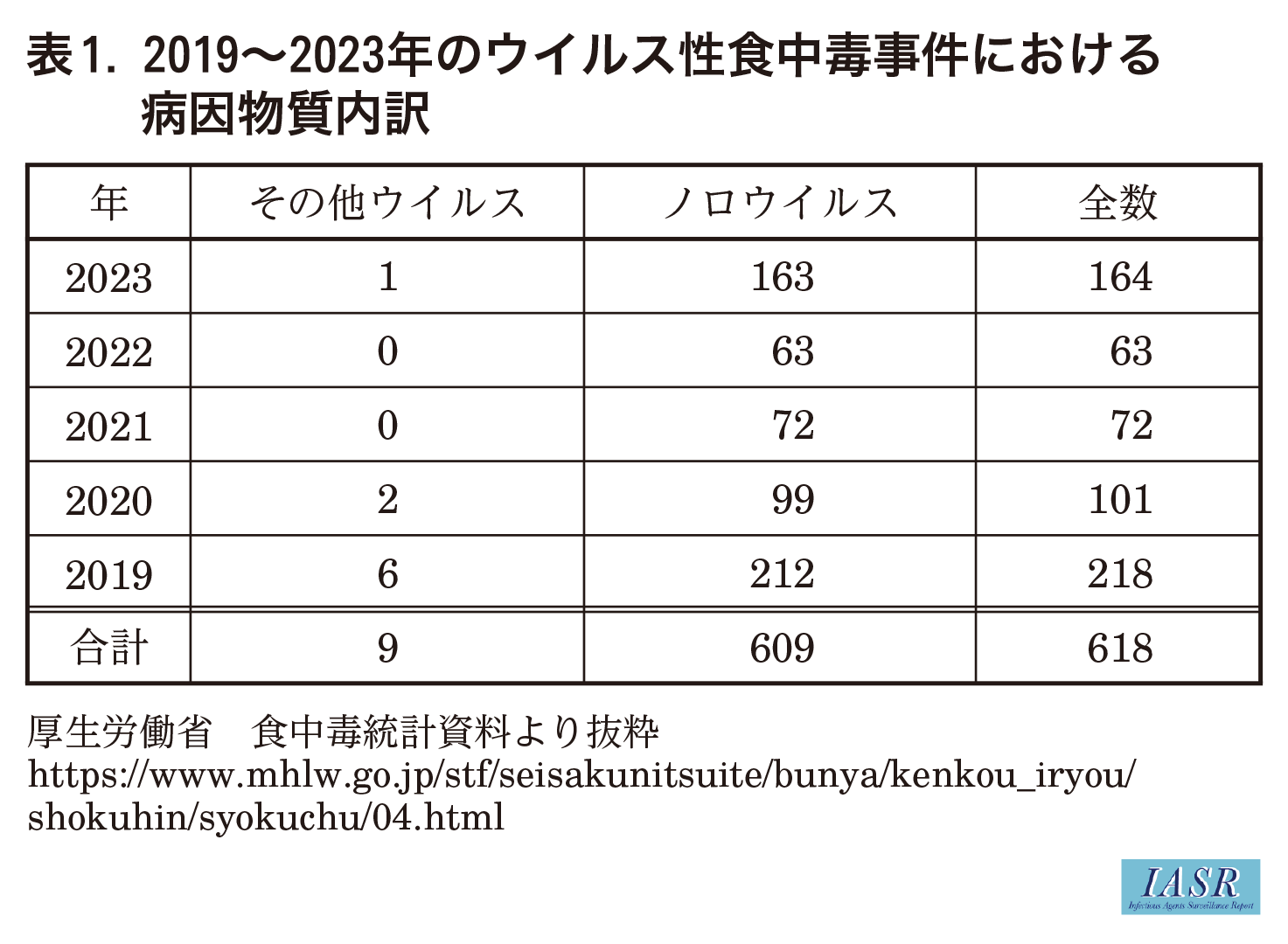 2019(令和元)~2023(令和5)年までの食中毒発生状況から 、ウイルス性食中毒の発生状況を抜粋した数値を表1に示した。日本では食中毒事件の主な発生施設が飲食店と報告されており 、新型コロナウイルス感染症(COVID-19)の影響を大きく受けた2020~2022年はウイルス性食中毒事件数も減少している。ウイルス性食中毒について 、原因となるウイルスはノロウイルスがほとんどであり 、ノロウイルス以外の「その他のウイルス」による食中毒事件報告数は5年間で全618件のうち9件と報告され 、これにはロタウイルスやサポウイルスが含まれる。