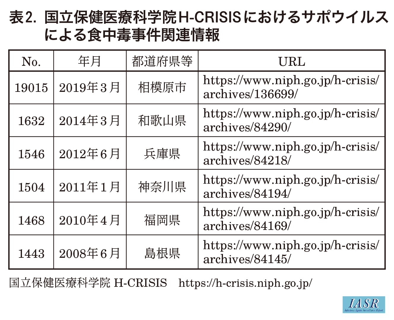 比較的アクセスしやすい情報源としては 、国立保健医療科学院が公開している健康危機管理支援ライブラリー(H-CRISIS)4)があり 、健康危機管理事例データベースにてサポウイルスやウイルス性食中毒として情報の絞り込みを行えば 、6件のサポウイルスによる食中毒事件に関する情報を得ることができる(表2)。また 、病原微生物検出情報 月報(IASR)にて過去にいくつかサポウイルスによる食中毒事件は報告されている5,6)が 、サポウイルスによる食中毒事件に関する情報は検索 、入手が簡単ではない状況にあり 、食品衛生上の課題の1つとして 、サポウイルスの認知度を高めるためには情報の入手性についても容易にしていく必要がある。