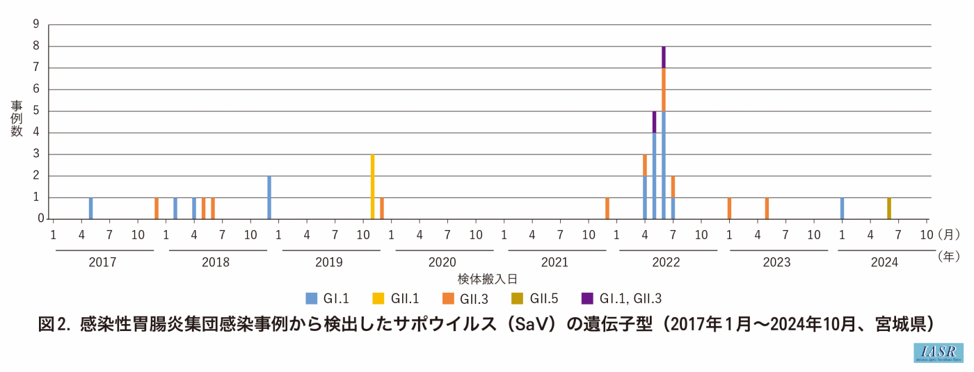 サポウイルス(Sapovirus: SaV)はカリシウイルス科に属し、急性胃腸炎を引き起こすことが知られている1)。カプシドタンパク質領域の塩基配列が遺伝子型の決定に用いられ、ヒトでは、G1注1(G1.1-GI.7)、G2(G2.1-G2.8、G2.NA1)、G4(G4.1)、G5(G5.1-G5.2)の遺伝子型に分類される。しかし、流行状況に関する情報が少ないため、我々はこれまでSaVの集団感染事例と散発例の遺伝子型について調査を行ってきた2)。今般、宮城県内において、SaVが原因と考えられる集団感染事例の集積が確認されたので、その概要について報告する。