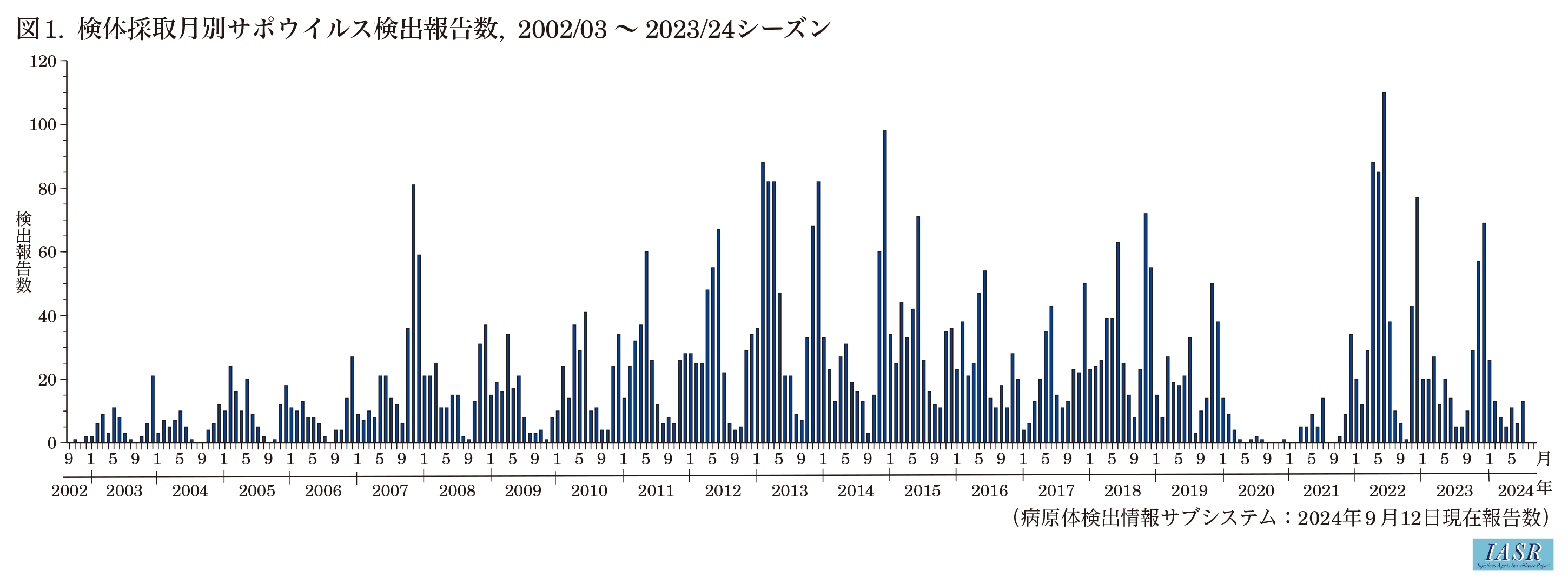 サポウイルスは、感染症法における5類定点把握対象疾患である感染性胃腸炎の原因病原体の1つであるが、サポウイルスによる感染性胃腸炎のみを示す発生動向(患者情報)は日本にはない。地方衛生研究所(地衛研)が感染症発生動向調査の病原体定点(小児科定点のうちの約10%)で感染性胃腸炎患者から採取された便材料や集団発生例の調査などで採取された検体の病原体検査を行い、感染症サーベイランスシステムの病原体検出情報サブシステムへの報告を行っている(病原体サーベイランス)。図1は病原体検出情報サブシステムに報告されたサポウイルス検出数に基づいて作成されている。サポウイルスは夏季に検出数が少なくなるものの通年検出されている(本号9ページ)。2022年は、病原体検出情報サブシステムでの集計開始以来、最も多くのサポウイルスが報告された2013年に次ぐ報告数であった(図1)。ヒト-ヒトおよび食品媒介性と考えられるサポウイルス集団発生事例(推定伝播経路別ノロウィルス感染集団発生の月例推移、2010/11~2023/24シーズン)が、保育所、幼稚園、小学校や(本号5&12、13、15、16ページ)、福祉養護施設、老人ホーム、病院、ホテル、家庭等で発生しており、飲食店、宴会場での集団食中毒事例の報告もある(サポウイルス感染集団発生の推定伝播経路別、原因施設・摂取場所の割合、2012/13~2023/24シーズン(PDF:456 KB))。サポウイルスの集団事例の発生場所、推定伝播経路(ヒト-ヒト伝播の疑い、食品媒介の疑い)はノロウイルスと同様である。