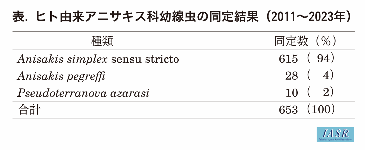 アニサキス食中毒は、アニサキスが寄生した魚介類の刺身、マリネなどの喫食により、多くが喫食後12時間以内に主に激しい腹痛をともなう胃腸炎症状を呈する。国内のアニサキス食中毒はAsが主な病因物質と考えられており、2011~2023年に当センターに検査依頼のあったヒト由来虫体の94.2%がAs、4.3%がApと同定されている(表)。マサバのアニサキス寄生調査において、内臓から筋肉部位への虫体の移行率がAsの方がApより約100倍高い結果が得られており3)、そのためヒト由来虫体にAsが多いと考えられる。また、アニサキス食中毒は他の細菌やウイルスによる食中毒と異なり、国内報告事例の97%が患者1名の孤発例である。また、他の食中毒と比較して原因施設が家庭のことが多く、そのため外食が自粛されたコロナ禍においても、他の食中毒件数が減少する中、アニサキス食中毒はほとんど減少していない。
