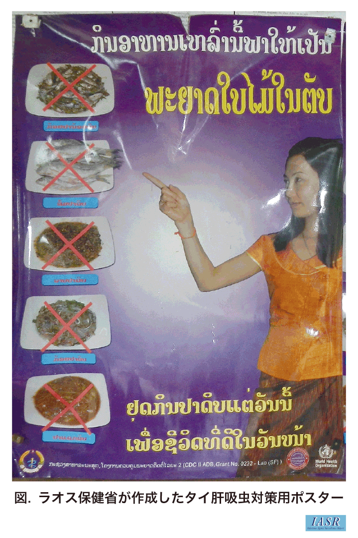 タイ肝吸虫症を防ぐために、 ラオス保健省ならびに世界保健機関(WHO)は淡水魚の生食を禁止するキャンペーンを実施してきたが、 魚の生食はラオスの食文化であり、 行動変容を促すのは非常に困難である。さらに、 少数民族や農村部では識字率が低いため、 生食を禁止する啓発ポスターを保健省が作成しても、 その意味を理解できない住民が多い(図)。またラオスで調査を実施すると、 生魚料理にライム汁を絞ることで寄生虫が死に、 感染予防になると信じている住民も多いことが明らかとなった。