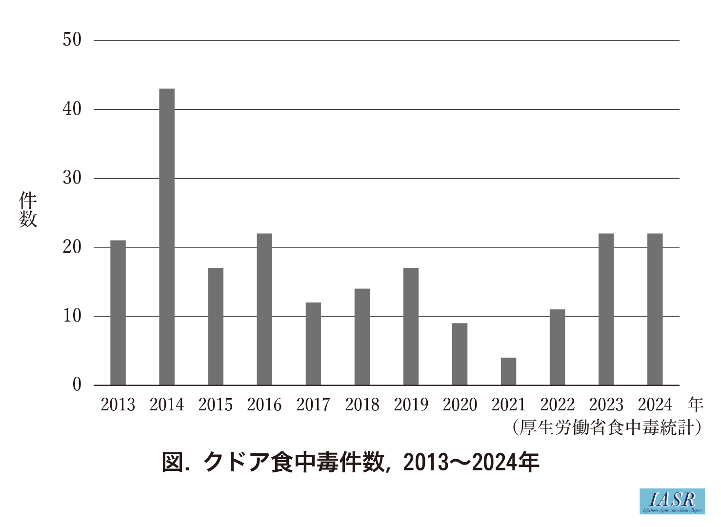 図は2013~2024年11月までの食中毒統計から抽出したクドア食中毒の事件数を示している。クドア食中毒の主因とされた養殖ヒラメのクドア対策が奏功し、 発生件数は2013年以前よりは減少している。しかしながら漸減する傾向はなく、 この10年は年間20件前後で推移している。2020~2022年の落ち込みは、 新型コロナウイルス感染症(COVID-19)による外出規制等の社会的影響によるものであろう。2010年頃クドア問題が拡大した背景の1つに、 日本へ輸入された韓国産養殖ヒラメの存在があった。実は韓国においても日本と同様のクドア食中毒が問題となっており1)、 最近は日本への輸出用ヒラメも含め韓国産養殖ヒラメは日本同等のクドア管理の下で生産されているという2)。