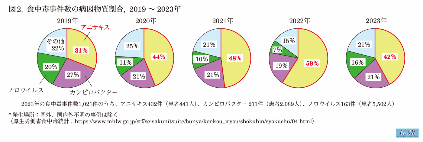 厚労省の食中毒統計(https://www.mhlw.go.jp/stf/seisakunitsuite/bunya/kenkou_iryou/shokuhin/syokuchu/04.html(外部サイトにリンクします))によると、食中毒の総事件数は2007年からほぼ横ばいであるが、アニサキス食中毒は増加傾向にあり、2013年の88件から2023年には432件に増加した(図1)。さらに、ここ5年では事件数はノロウイルスやカンピロバクターを上回り、食中毒事件数の第1位である(図2)。2017年ごろから増加した背景には、著名人の感染報道による知名度向上や医師の認識向上、流通やグルメ化の進展による生食の多様化があると考えられる。感染源も変化し、2018年は温暖化による黒潮の変化で漁獲量が増加したカツオが主な原因魚となった(本号3ページ)。