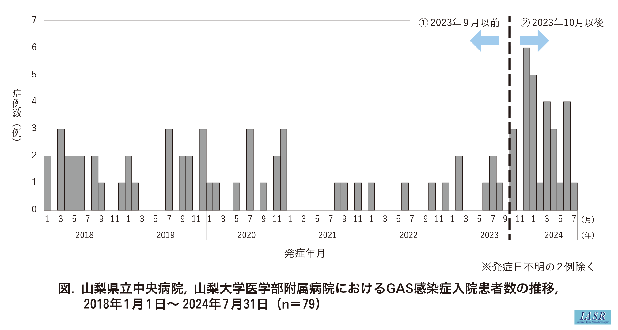 症例定義は, 山梨県立中央病院または山梨大学医学部附属病院において, 2018年1月1日~2024年7月31日までに採取された臨床検体からGASが検出されたGAS感染症入院患者, とした。診療録より, 症例の属性, 基礎疾患, 発症1カ月以内の呼吸器ウイルス感染症罹患歴, 発症日, 臨床診断名, 転帰等の情報を収集し, 記述的にまとめた。特に症例の増加前後で2群に分けて(図の1 2023年9月以前と2 2023年10月以降)解析を行った。なおSTSSの定義は, 感染症発生動向調査の届出基準に準じた3)。重症例は, 入院中にICU(intensive care unit)入室, ECMO(extracorporeal membrane oxygenation)の使用, カテコラミンの持続投与, 転帰が死亡, のいずれかに該当する症例と定義した。