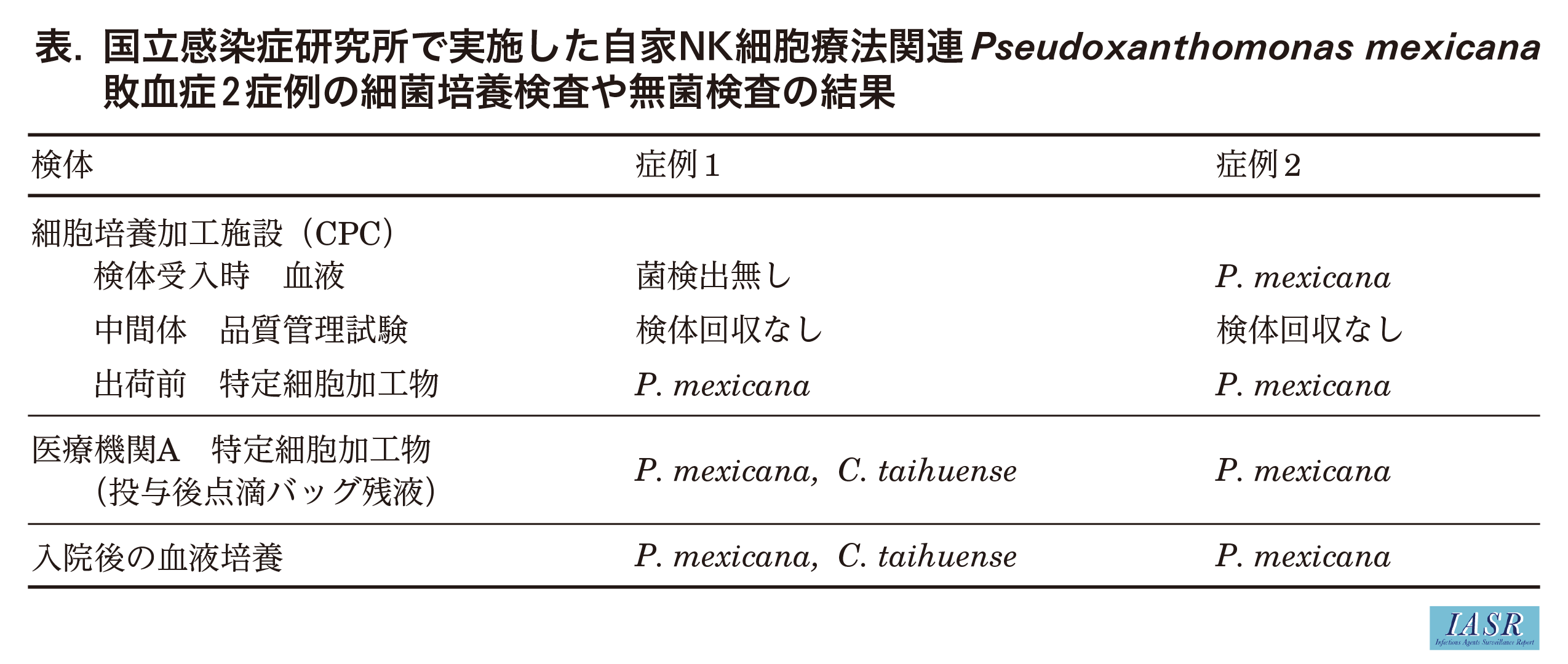 本事例ではCPCで汚染された特定細胞加工物を投与された2名がP. mexicanaによる敗血症を発症したと考えられた。症例2の検体採取からCPCでの受入時の無菌試験までの段階でのP. mexicanaの混入と症例1検体との交差汚染の少なくとも2回以上の汚染が起こっていたと考えられた。本調査の制限として、実際に行われていた作業工程が十分把握できず、他に汚染があり得た工程があった可能性がある。