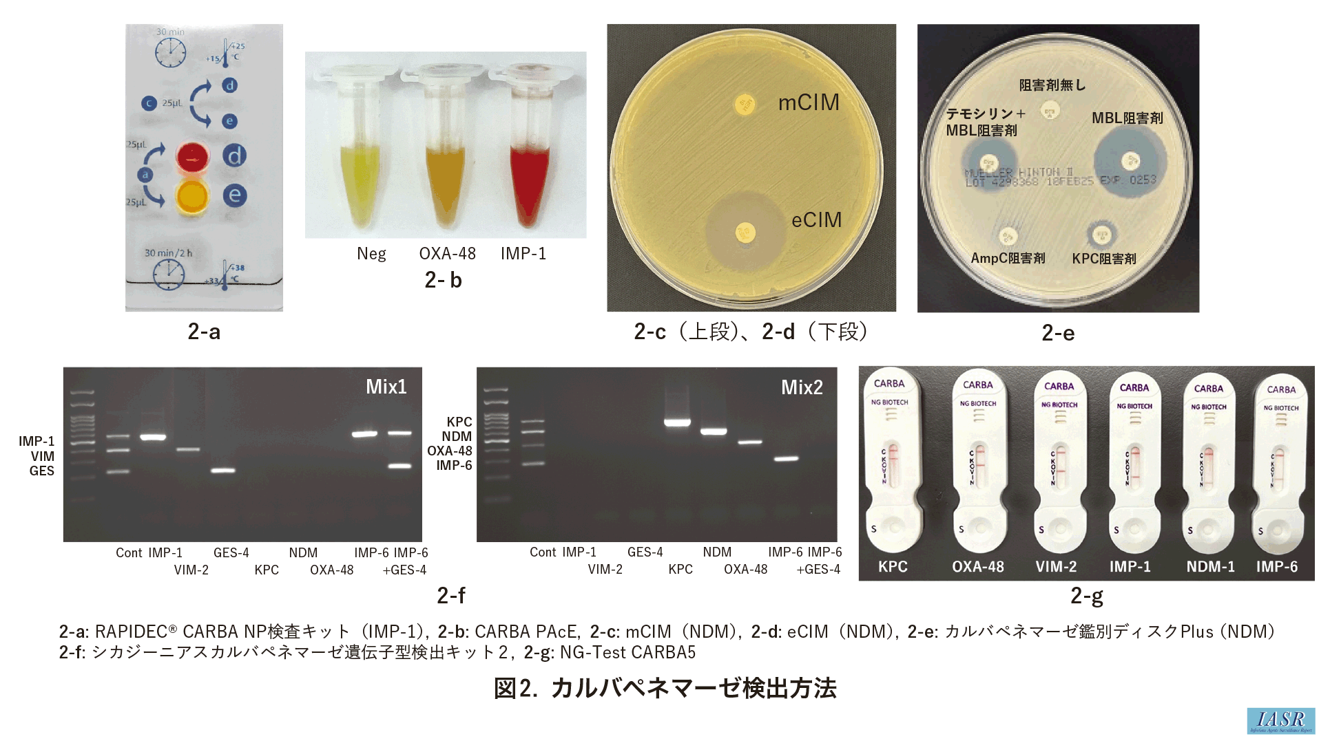 表現型検査では検出が困難な耐性機序も存在するため, イムノクロマト法や分子生物学的手法(PCR法など)による薬剤耐性遺伝子の確認が必要な場合がある。腸内細菌目細菌においては, 各種カルバペネマーゼ(例: IMP型, VIM型, KPC型, NDM型, OXA型, GES型)を対象としたmultiplex PCRにより検出が可能である。日本ではこれら遺伝子検査の試薬が市販されており, 迅速かつ効率的な検出が可能である(図2-f)。また, イムノクロマト法では菌液を調製するだけで簡便に酵素型を判別することが可能であり, 実用性も高い(図2-g)。さらに, 血液培養陽性検体や呼吸器検体からの網羅的な迅速遺伝子検査を可能とする試薬・機器も開発され, カルバペネマーゼ産生遺伝子の直接検出・同定が可能となっている。