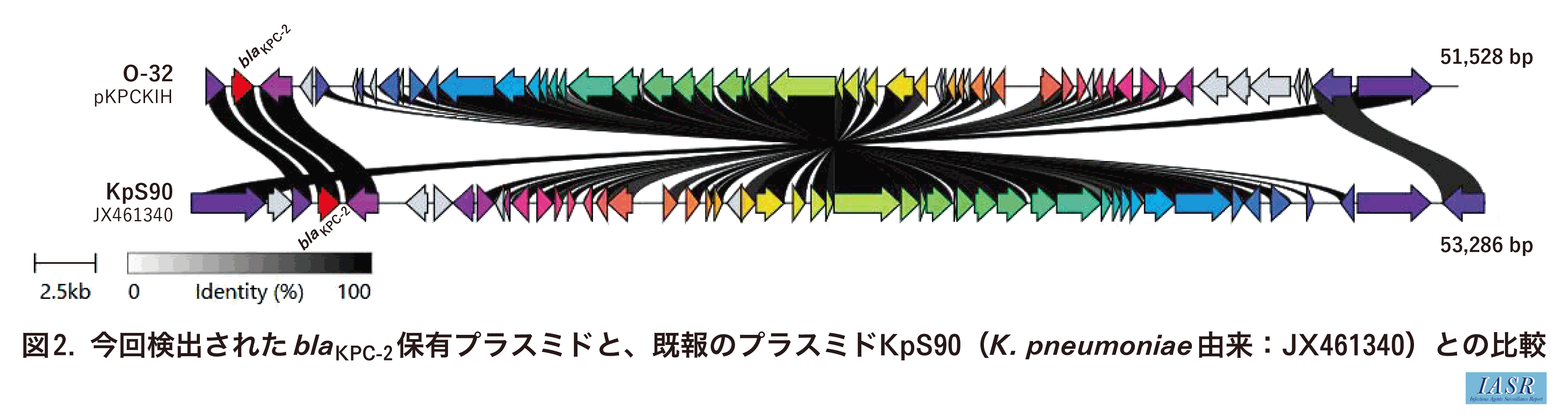 2名の患者由来4株および患者の病室を含む5カ所の手洗い用シンクの排水口由来6株はE. kobei ST32と同定され, blaKPC-2を内包する同一のプラスミドを保有していた。また, 別の3カ所の手洗い用シンクの排水口からは, 遺伝子型が異なるE. kobei ST24(2株)とST27(1株)が検出され, これら菌株からも上記と同一のプラスミドの保持が確認された(図1)。今回, 検出されたblaKPC-2保有プラスミドは, 51,528bp(60個のORFを含む)であり, replicon typeはIncX3であった(図2)。Blast検索の結果, このプラスミドの90%以上の領域がKlebsiella pneumoniae由来のプラスミドpKpS90(Accession No. JX 461340.1)と高い相同性を示した。