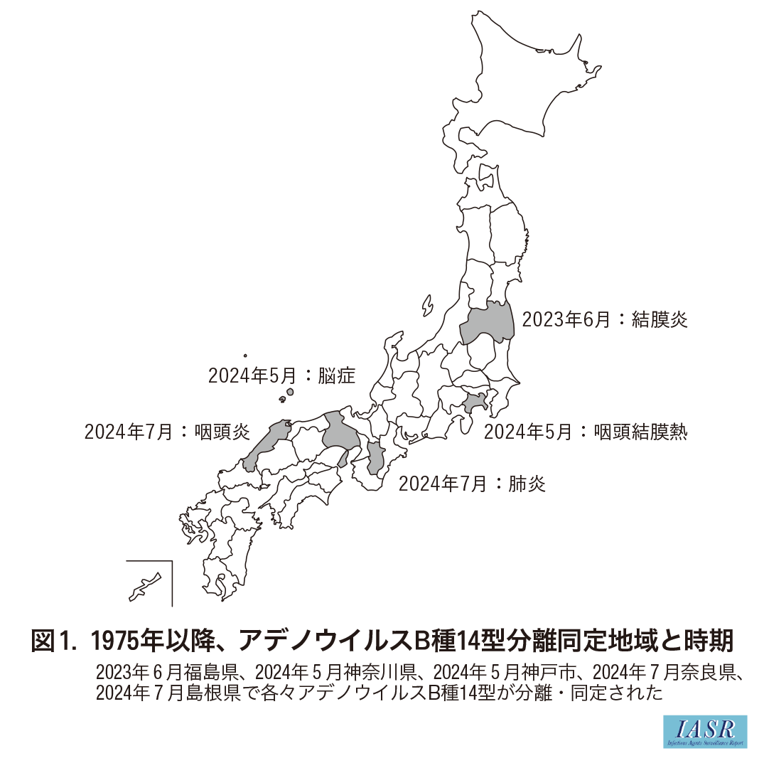 1975年以降, アデノウイルス(Ad)に関連する咽頭結膜熱や流行性角結膜炎等の発生動向と関連するAd型が記録されている。これまでAd-B種14型(Ad-B14)については1989年と1991年に東京都で各々1症例の記録(方法等詳細不明)はあったものの, 分離同定や詳細解析の報告はなかった。