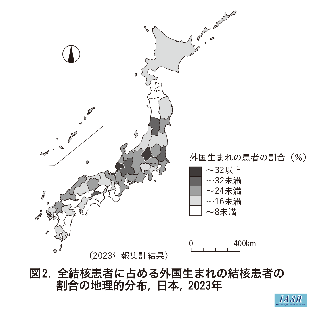 図2に都道府県別の全結核患者に占める外国生まれの結核患者の割合の地理的分布を示す。群馬県(38.5%), 福井県(33.3%), 岐阜県(29.0%)などでその割合は高い。