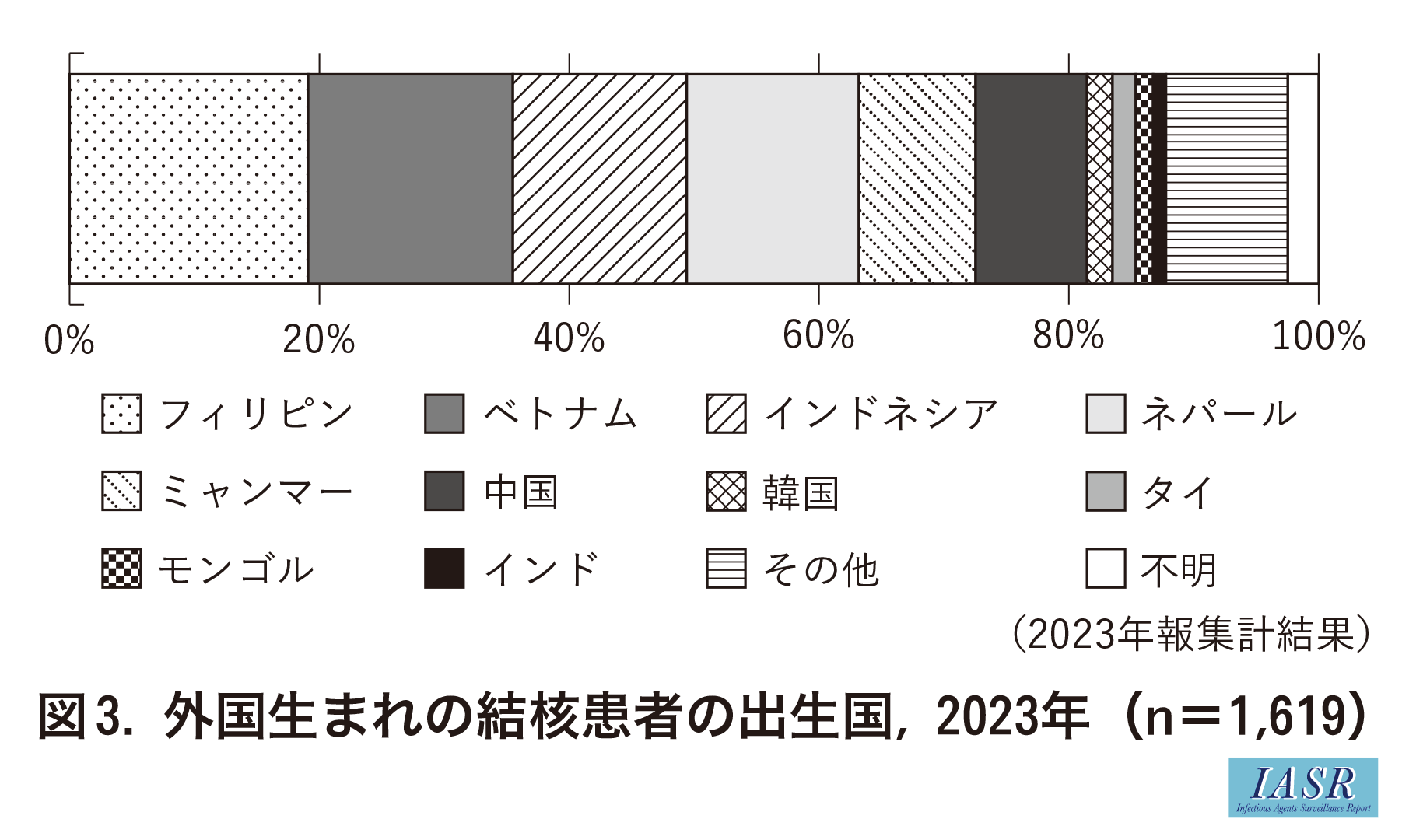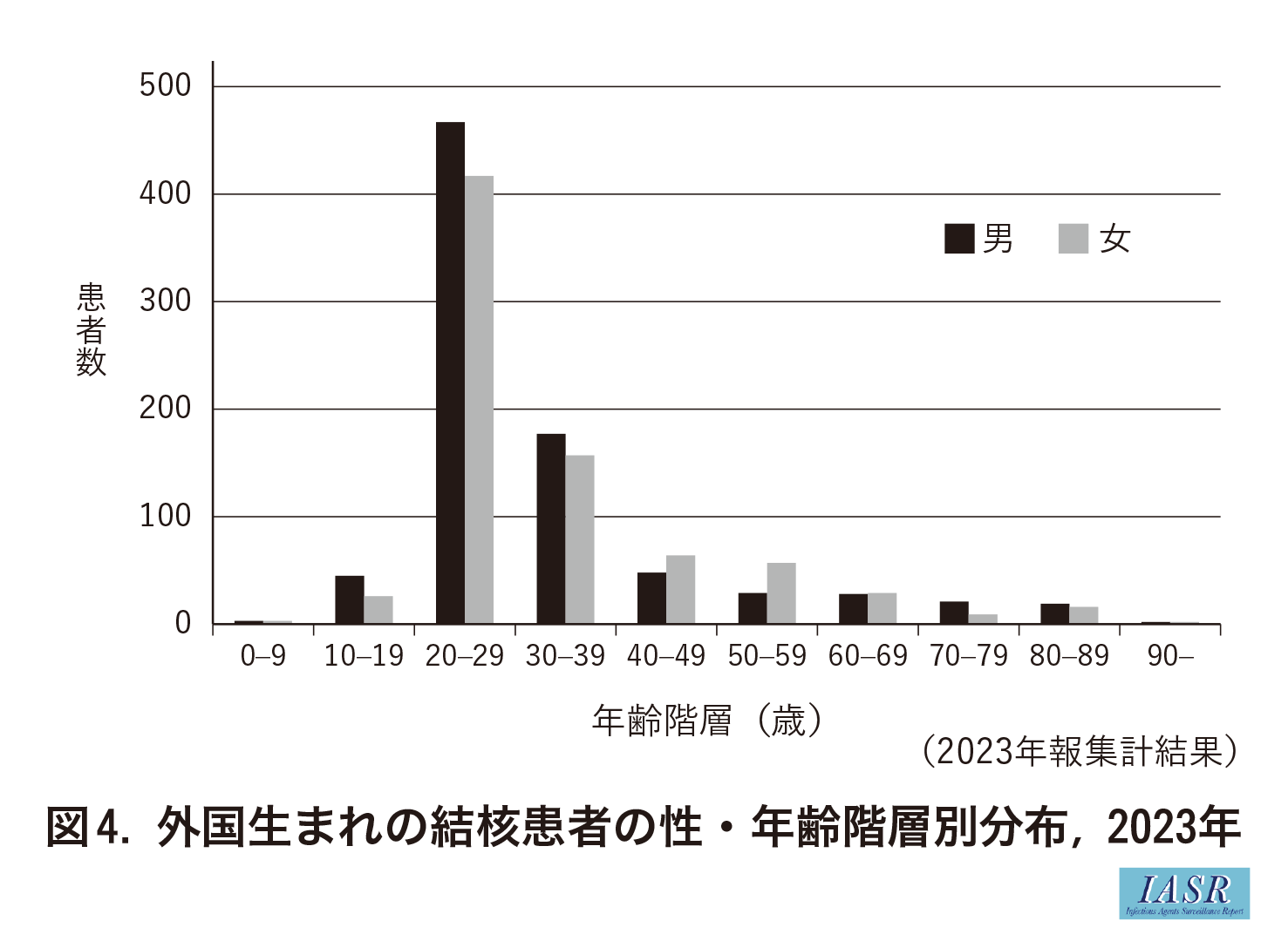 図3に外国生まれ結核患者の出身国を示す。上位はフィリピン(317人), ベトナム(272人), インドネシア(231人), ネパール(229人), ミャンマー(155人), 中国(148人)の順となっている。図4に2023年の外国生まれ結核患者の性・年齢階層別報告数を示す。20代の外国生まれの結核患者数は, 男女それぞれ400名以上と圧倒的に多い。
