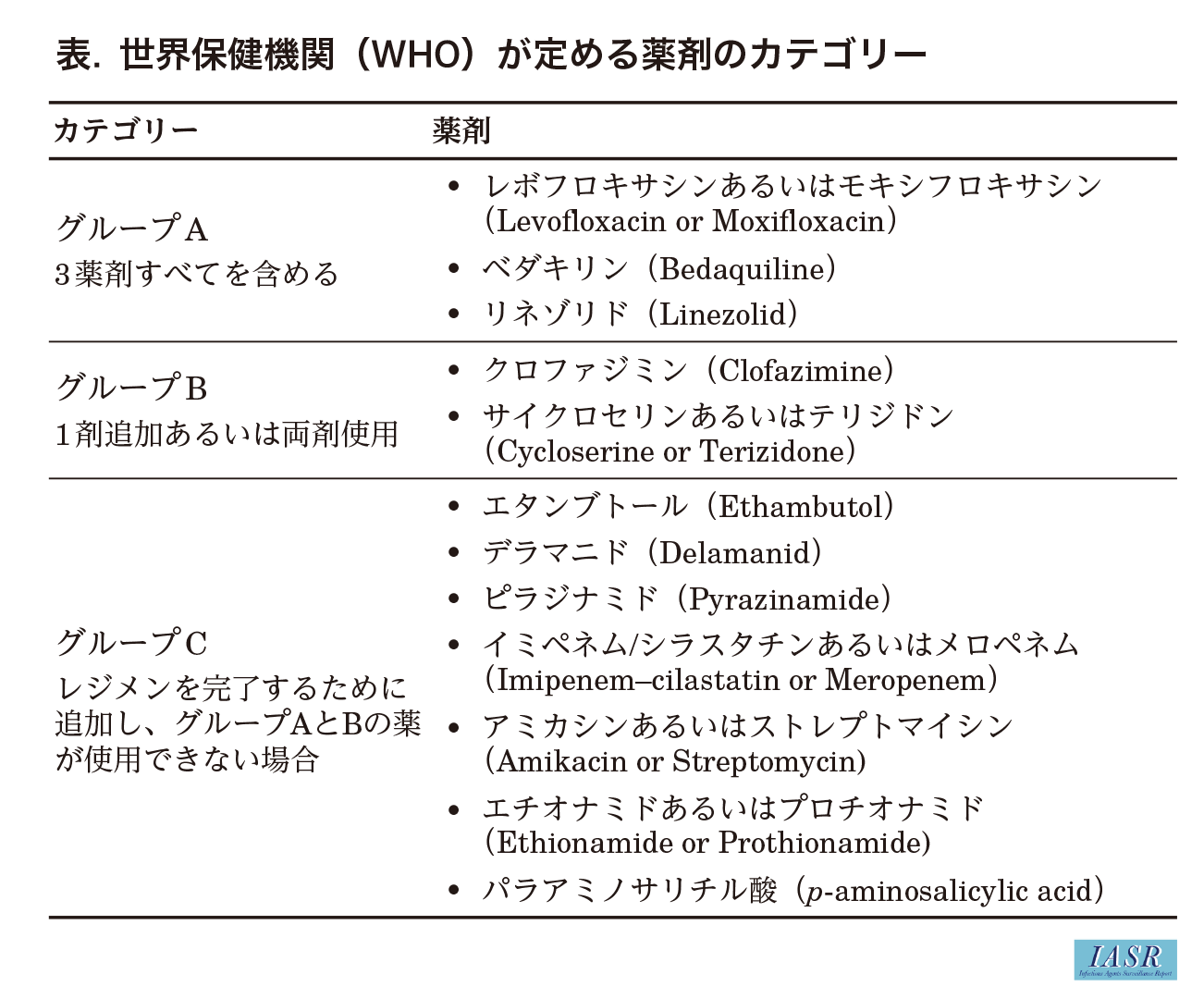WHOが2021年1月27日にwebサイト上で公表した「Meeting report of the WHO expert consultation on the definition of extensively drug-resistant tuberculosis, 27-29 October 2020」3)によると, XDR-TBの定義が変更され, 2021年1月から適用された。WHOは将来的にまた定義が変更されることも想定し, 今回のXDR-TBの変更に至っている。表にWHOが定める薬剤のカテゴリーを示す。新しいXDR-TBの定義は, 従来のMDR-TBに加えて, 少なくとも1つのフルオロキノロン薬およびもう1つのグループA薬剤に耐性を有すること, となっている。ここでグループAの薬剤とはレボフロキサシン(Levofloxacin: LVFX), モキシフロキサシン(Moxifloxacin: MFLX), ベダキリン(Bedaquiline: BDQ)およびリネゾリド(Linezolid: LZD)となっている(表)。LVFXとMFLXはフルオロキノロン薬であるから, LVFXとMFLXのどちらか一方に耐性で, なおかつBDQとLZDのどちらかに耐性を有するMDR-TB, という定義となる。