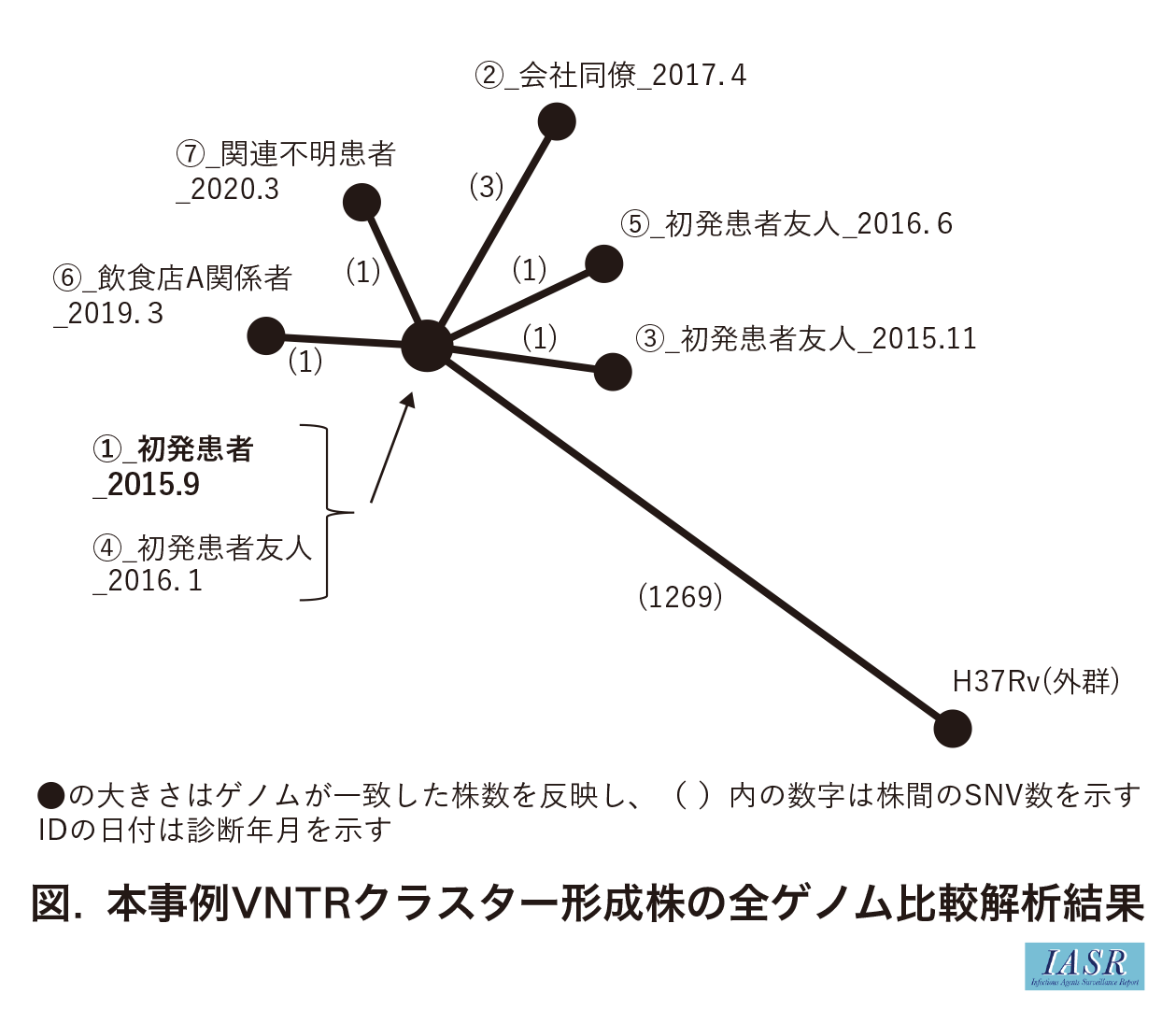 本事例は2015年に結核集団感染として厚生労働省に報告した事例で, 初発患者は2015年1月に発症し, 同年9月に診断・治療を開始した(患者ID1_2015.9)。直後の接触者健診により, 同居家族2名の発病(いずれも菌陰性), 職場の同僚1名の発病(菌陰性), 後にさらに2名の発病(菌陰性1名, 菌陽性1名: 患者ID2_2017.4)と4名の潜在性結核感染症(LTBI)が認められた。初発患者の交友関係の調査は困難で, 接触者健診を実施できた人以外の友人3名の発病(いずれも菌陽性: 患者ID3_2015.11, 4_2016.1, 5_2016.6)が順次認められた。初発患者1と友人3は飲食店A, 初発患者1と友人4および5は飲食店Bで交流があった。また, 追加の接触者健診により, 1の親族1名, 1と3の友人1名, 飲食店Bの関係者1名がLTBIと診断された。2019年には, 初発患者1の接触者として3年の経過観察を終了した飲食店Aの関係者(患者ID6_2019.3)が市民健診を契機に活動性肺結核と診断された。