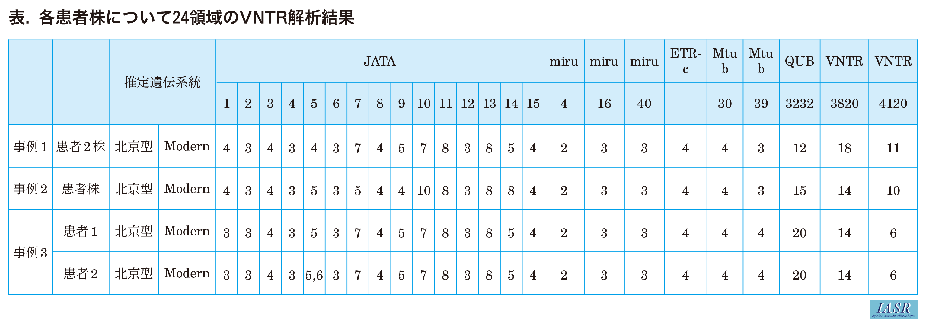 2年前に登録となった患者Aと同一の職場で新たに患者Bが発生した。感染源調査を進めるうえで同一感染源かどうかを把握するために, VNTR解析を実施した。川崎市健康安全研究所にすでに搬入されていた患者Aの分離株および新たに届け出られた患者Bの分離株についてVNTR解析を実施したところ, 24領域すべて一致し, 同一感染源であったことが示唆された(表)。この結果をもとに, 感染源調査の範囲を設定することができた。