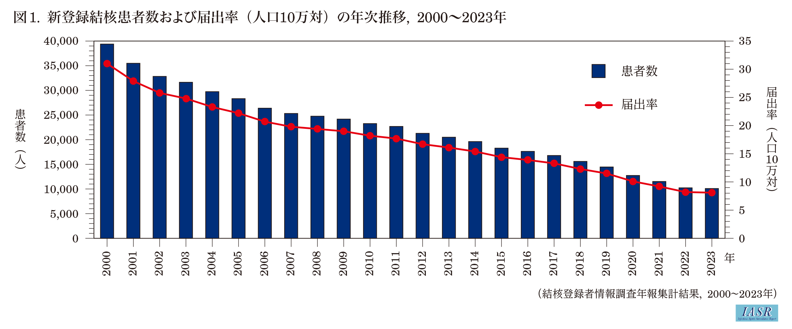 (IASR Vol. 46 p47-48: 2025年3月号)結核は感染症法において2類感染症に分類される感染症である。結核患者を診断した医師は患者の発生を直ちに保健所へ届け出なければならない(届出基準: https://www.mhlw.go.jp/bunya/kenkou/kekkaku-kansenshou11/01-02-02.html(外部サイトにリンクします))。結核患者の届出の義務化は1951年の旧結核予防法の改定により始まったが, 2007年に旧結核予防法は感染症法へと統合された。ここでは, 医師による届出を基に全国の都道府県・政令指定都市・特別区から保健所を通じて報告される結核患者の状況(2023年1月1日~12月31日)を取りまとめた2023年結核登録者情報システム(結核サーベイランス)の年報データを中心に, 最近の日本の結核患者の発生状況等について述べる。