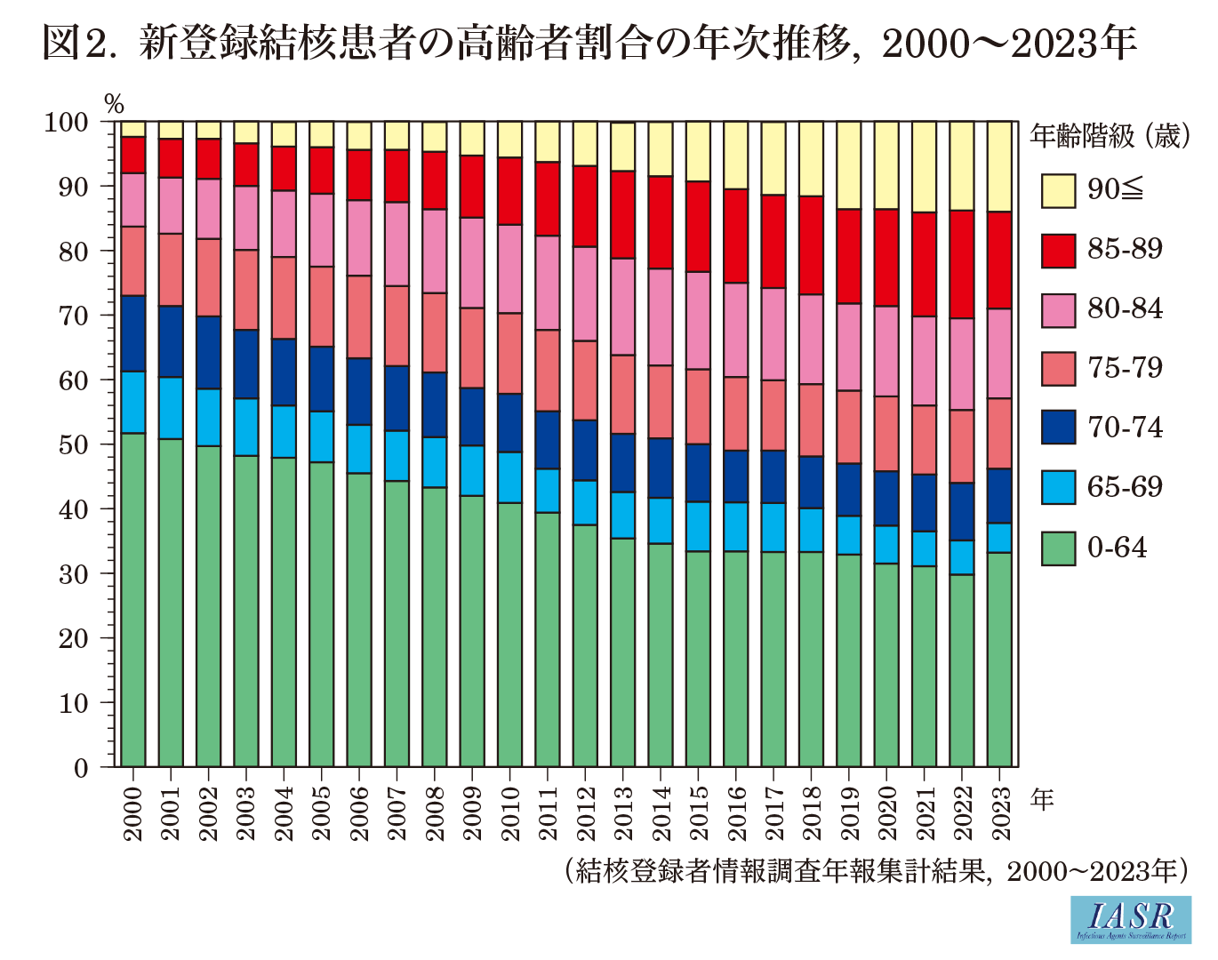 治療成績: 2022年の新登録結核患者10,216人の2023年末での治療成績は, 治癒と完了をあわせた治療成功が64.9%, 死亡27.0%, 治療失敗0.1%, 治療の脱落中断1.9%, 転出1.6%, 12カ月を超える治療4.3%, 判定不能0.2%であった。判定不能には, 薬剤耐性などにより標準治療ではない患者, 治療内容についての情報が不足している患者等が含まれる。治療成功率は, 世界保健機関(WHO)の目標である85%に達していない。その大きな要因は, 新登録結核患者の約30%が80歳以上と高齢化し, 死亡割合が高いことである。59歳以下の患者の年齢階級別の治療成功割合は82.1-89.9%となっている。