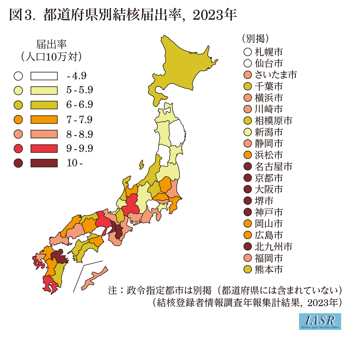 おわりに: 2021年に結核低まん延の水準である結核罹患率10.0以下を達成し, その後も結核低まん延の状態が継続している。しかし, 予防指針を軸とした結核対策を持続するとともに, 高齢化を続ける結核患者と若中年層での外国出生患者の増加, さらに都市部を中心とする結核患者発生の偏在化による地域間の届出率の格差の顕在化といった課題に対し, 結核サーベイランスおよびレファレンスシステムの維持・改良, 入国前結核スクリーニングの実施, 早期診断・治療完了のために国民, 長期滞在外国人, および医療関係者を対象とした教育・啓発, 接触者健診体制の充実等, 多面的対策が必要である。
