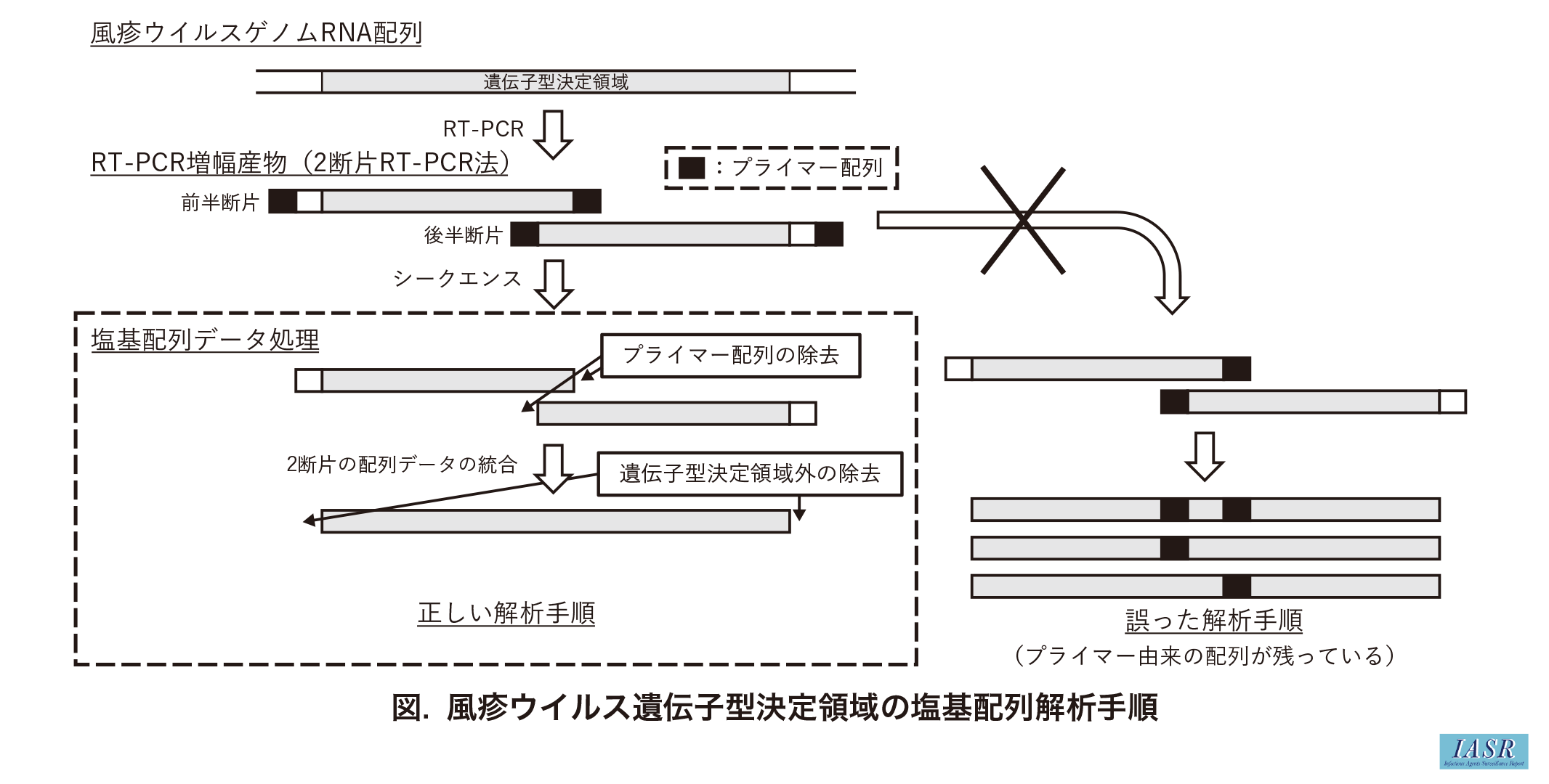 風疹ウイルスの遺伝子型決定部位は比較的長く, PCR増幅感度がやや低い。病原体検出マニュアル2)ではその改善のため, オーバーラップする前後2断片に分けて増幅し, 塩基配列をつなぎ合わせて全長配列を決定する方法を記載している。その際, オーバーラップ領域に含まれるPCRプライマー由来の配列を適切に除去する必要がある(図)。10施設でこのトリミングに起因する誤回答が認められた。正しい手順の理解が必要である。