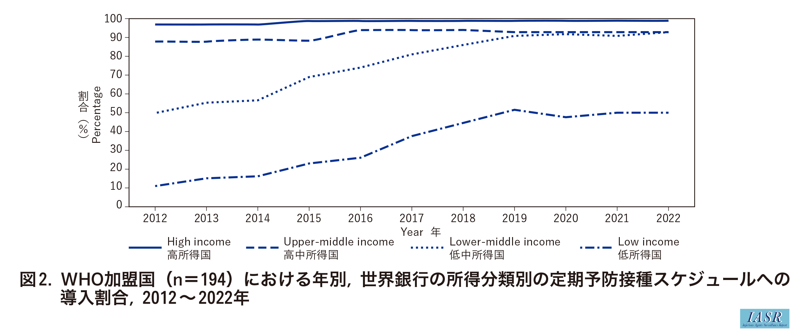 低所得国, 低中所得国(世界銀行の2022年所得分類に基づく)におけるRCV導入は着実に増加した(図2)。2012年は低所得国の11%, 低中所得国の50%に限られたが, 2022年には低所得国の50%(13/26), 低中所得国の94%(51/54)まで拡大した。乳児のRCVの1回目接種率は, 世界全体で2012年の40%から2022年には68%に増加したが, 大きな地域差を認めた〔36%(AFR)~93%(EUR)〕。2022年のRCV接種率(RCV未導入国を除く)は, 低所得国27%, 低中所得国70%, 高中所得国88%, 高所得国93%であった。