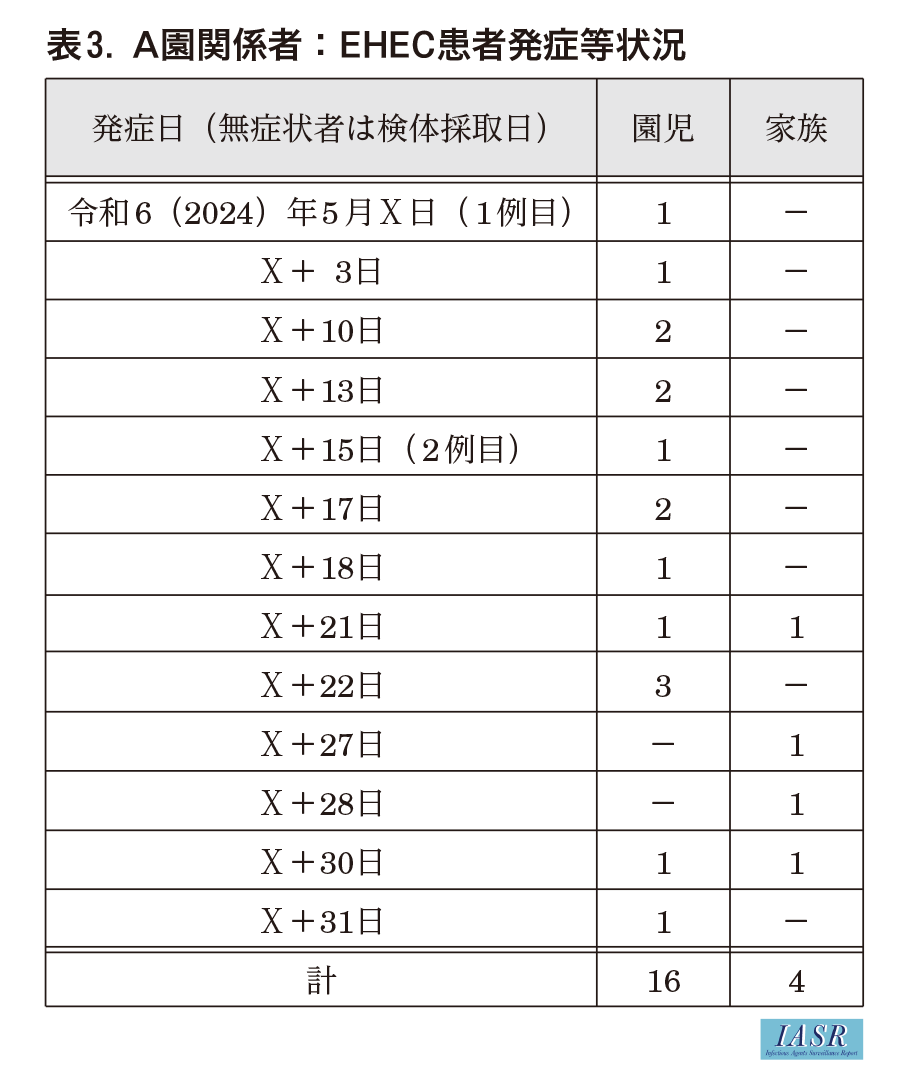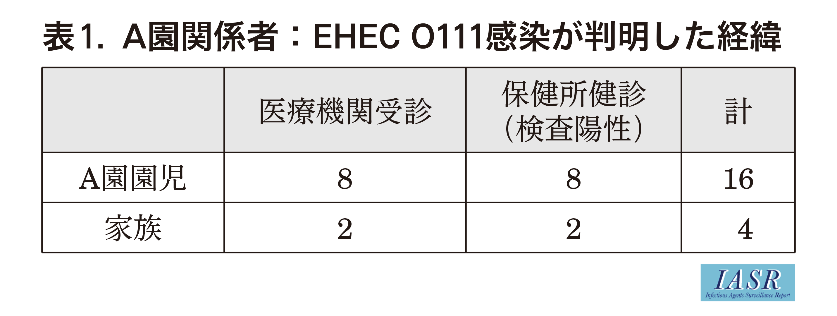 2024年6月, 管内医療機関より, A園園児についてEHEC感染症の届出がされた。当該届出を受け, 当所では積極的疫学調査を実施。聞き取りの結果, 当該園児は発生届出の8日前に発症し, 以降A園には登園していないことが判明した。この時点では, 明確な感染源は不明であり, 接触者健康診断として同居家族の検便を実施したが, 全員陰性であった。