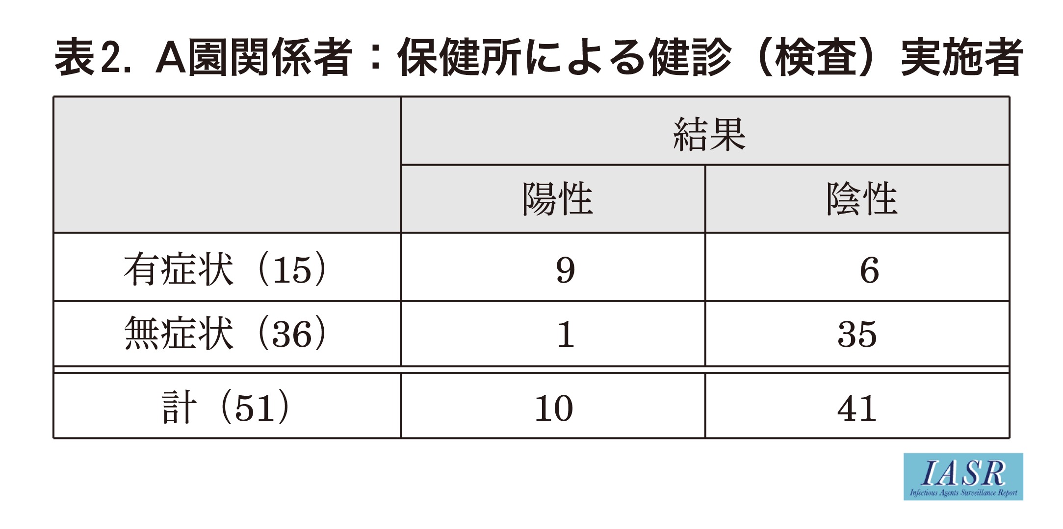 1例目については, 届出から7日目に菌陰性化が確認された。その際, A園への聞き取り調査を再度実施したが, 有症状者の増加はみられないとの回答であった。