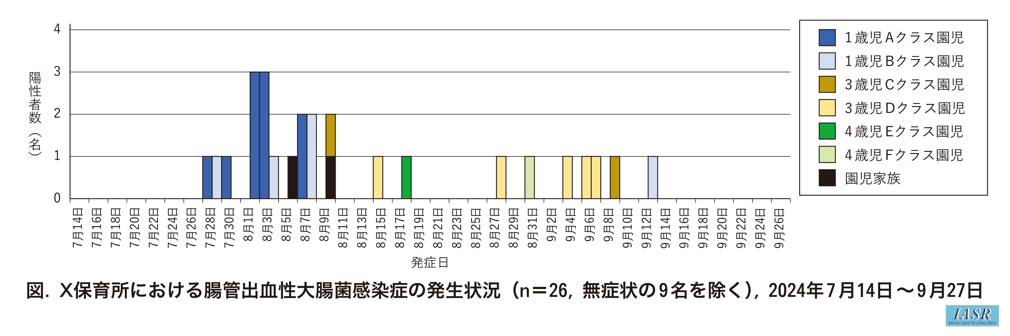 園児および職員約250名, 園児家族約70名に対して検便を実施した。その結果, 2024年8月5日~9月25日までの間に, 園児25名, 職員2名, 園児家族8名の計35名がEHEC O26に感染していたことが判明した(以下, 陽性者)。