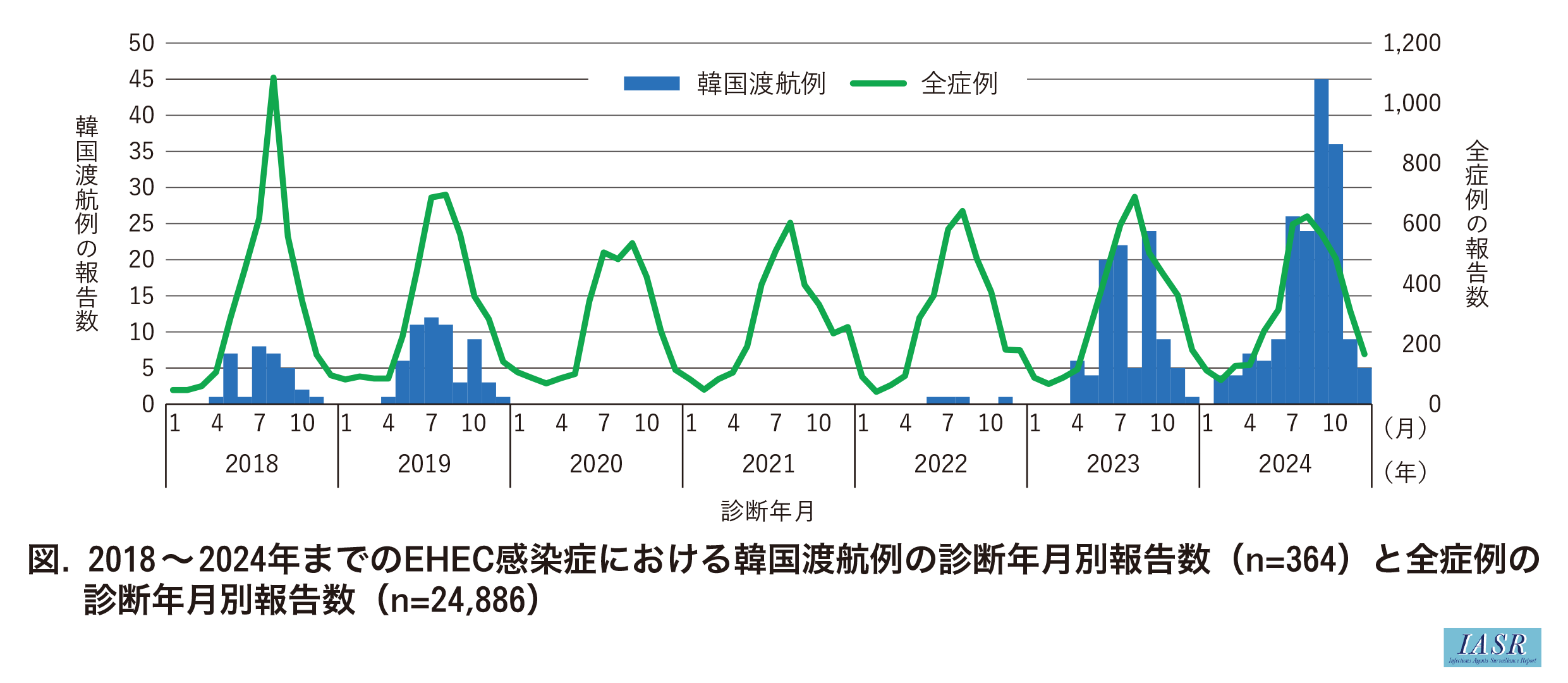 韓国渡航例の症例定義に合致した症例数は364例で, その推移は, 2018年32例, 2019年57例, 2020年0例, 2021年0例, 2022年4例, 2023年96例, 2024年175例であった。新型コロナウイルス感染症(COVID-19)のパンデミックにより渡航が制限されていた2020~2022年を除くと, 韓国渡航例の報告数の増加がみられた(図)。EHEC全体である全症例の数は, 2018~2024年に3,090-3,855例で推移した。各年における韓国渡航例の報告数の診断月別ピークは, 2018年が7月(8例), 2019年が7月(12例), 2023年が9月(24例), 2024年が9月(45例)で, いずれもピーク数は増加しており, 全症例と同様に夏季に増加し, 冬季に減少していた。