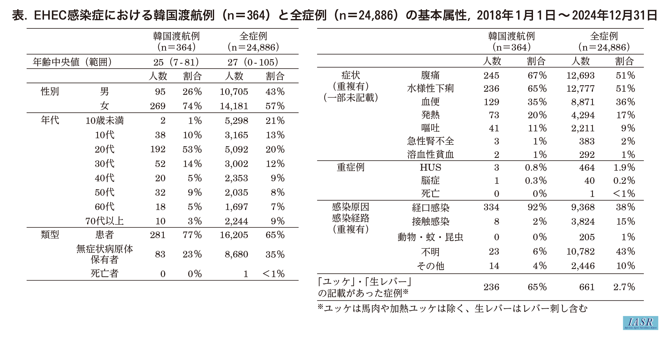 2018~2024年に症例定義に合致した韓国渡航例(364例)と全症例(24,886例:韓国渡航例含む)の基本属性を比較した(表)。韓国渡航例の年齢中央値は25歳(範囲:7~81歳)で, 全症例は27歳(範囲:0~105歳)であった。性別は女性で韓国渡航例(74%)が全症例(57%)よりも高い割合であった。年代は韓国渡航例で20代(53%)が全症例(20%)よりも高い割合であった。また, 職業は韓国渡航例で会社員(14.8%)が最も多く全症例(9.4%)よりも高い割合であった。また, 大学生(6.3%)は全症例(2.0%)よりも高い割合であった。重症例については, 韓国渡航例のうちHUSが3例(0.8%), 脳症が1例(0.3%)報告された(全症例のHUSは1.9%, 脳症は0.2%)。感染原因・感染経路については, 韓国渡航例の大半(92%)が経口感染と報告された。また, 備考欄等の記載にユッケ(馬肉や加熱ユッケは除く)または生レバー(レバー刺し含む)の記載があった症例は, 韓国渡航例(65%)が全症例(2.7%)よりも高い割合であった。以上から, 韓国渡航例の特徴は, 全症例と比較して, 20代や女性に多く, 職業は会社員・大学生が多く, 生肉等喫食の記載の割合が高く, 重症例(HUSと脳症)が同程度の割合で報告されていた。