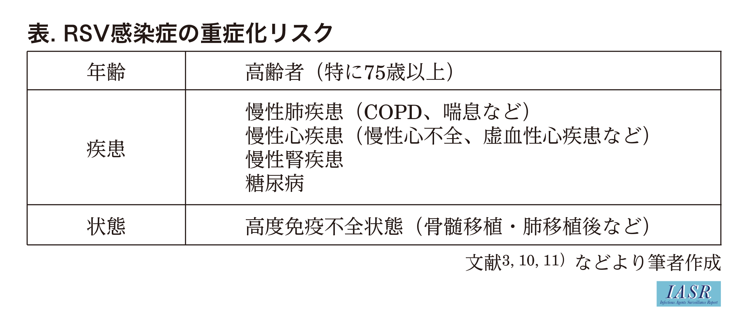 健常成人のほとんどは自然軽快するが, 高齢者や基礎疾患(慢性閉塞性肺疾患: COPD, 虚血性心疾患, 慢性心不全, 脳血管障害の既往, 糖尿病, 慢性腎不全など)があると重症化しやすく, 入院する場合がある。また, 造血幹細胞移植や肺移植などの高度の免疫不全患者では, 下気道感染になりやすく重症化しやすい3,10)。成人のRSV感染症で重症化リスクが高い状態を表に示す。なお, RSV感染症とインフルエンザの米国の入院患者の比較では, 介護施設への入所が必要な状態になる頻度はインフルエンザとRSV感染症で同等であった11)。