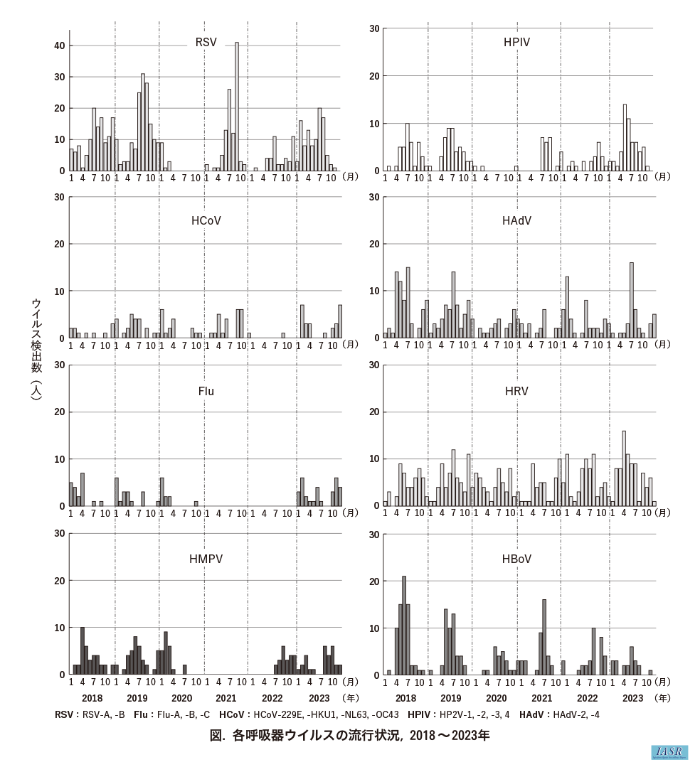 本研究では, 2018年1月~2023年12月の間に福島県内の単一の二次医療機関に入院した発熱や気道症状を認めた15歳未満の患児全例の鼻腔咽頭スワブを採取した。各臨床検体から核酸精製後, 以下の18種類のウイルスをreal-time PCR法にて検出した4)。RSウイルス(RSV)-A, -B, インフルエンザウイルス(Flu)-A, -B, -C, ヒトコロナウイルス(HCoV)-229E, -HKU1, -NL63, -OC43, ヒトメタニューモウイルス(HMPV), ヒトパラインフルエンザ(HPIV)-1, -2, -3, -4, ヒトライノウイルス(HRV), ヒトアデノウイルス(HAdV)-2, -4, ならびにヒトボカウイルス(HBoV)。SARS-CoV-2に感染した小児は本研究から除外した。各年におけるウイルスの検出状況や, その特徴について検討した。