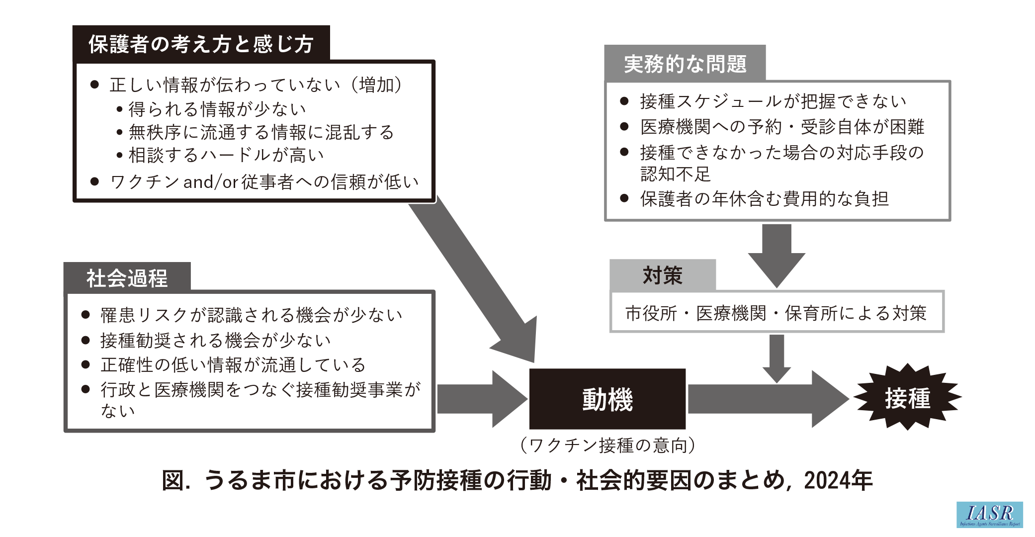 これを踏まえて, うるま市の接種率向上のためには, 行政および地域の予防接種関係者が「保護者の考え方と感じ方」や「社会過程」への対応を優先することが重要であると考えられた。具体的には, 保護者の疑問や懐疑的な声にも応えられる相談体制を整備し, 正確な情報を多様な手段で発信・周知することが求められる。また, 健診会場や未接種者へのフォローなど, 接種勧奨の機会を増やし, 地域医療機関と連携した勧奨活動の継続も効果的である。さらに, 現行の「実務的な問題」への対策を維持しつつ, 保護者が受診しづらい背景の調査を行うことで, さらなる接種率向上につながると考えられる。