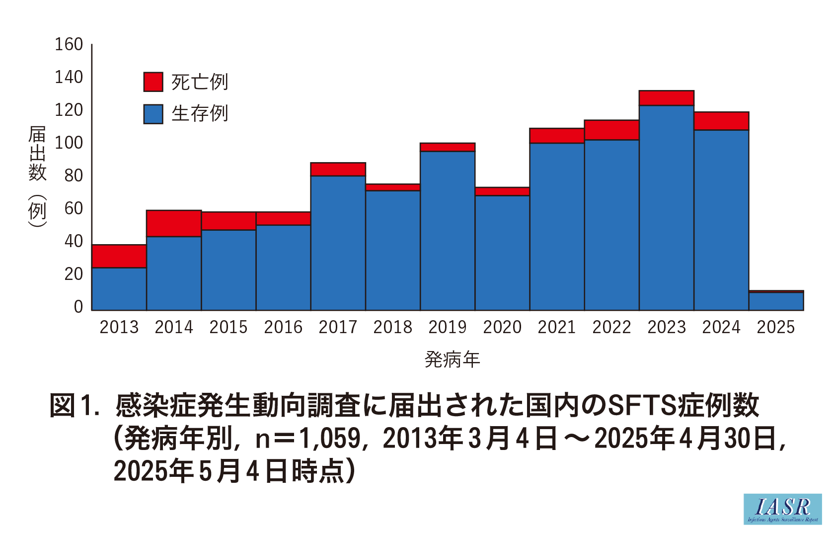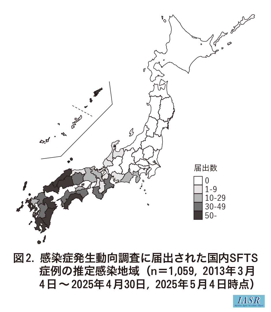 今般, 2013年3月4日~2025年4月30日までに感染症発生動向調査システムへ届け出られたSFTS発生届の記載内容をもとに症例の疫学情報をまとめた。なお, 本内容は2025年5月4日時点の情報であり, 今後, 更新される可能性があることに留意されたい。