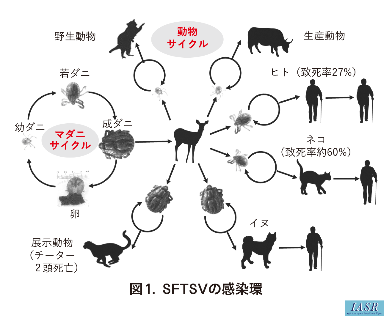 SFTSV保有マダニに吸血された場合, すべての哺乳動物が感染すると思われる。しかし, 発症動物については, ヒト, イヌ, ネコ, チーター以外の報告はまだない。多くの動物が感染しても不顕性感染していると考えられる。流行地の野生動物であるイノシシやシカでの抗SFTSV抗体保有率は非常に高い。一方, SFTSV遺伝子はアライグマなどの食肉目の動物の血液から高率に検出されている。野生動物での抗SFTSV抗体保有率が高い地域ではヒト患者の発生も多い。