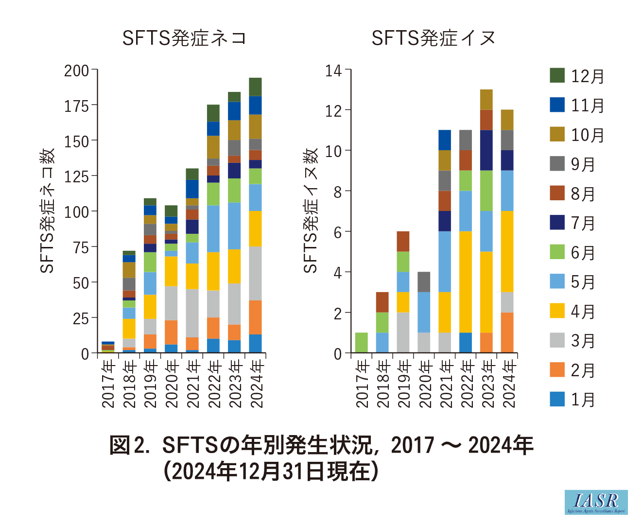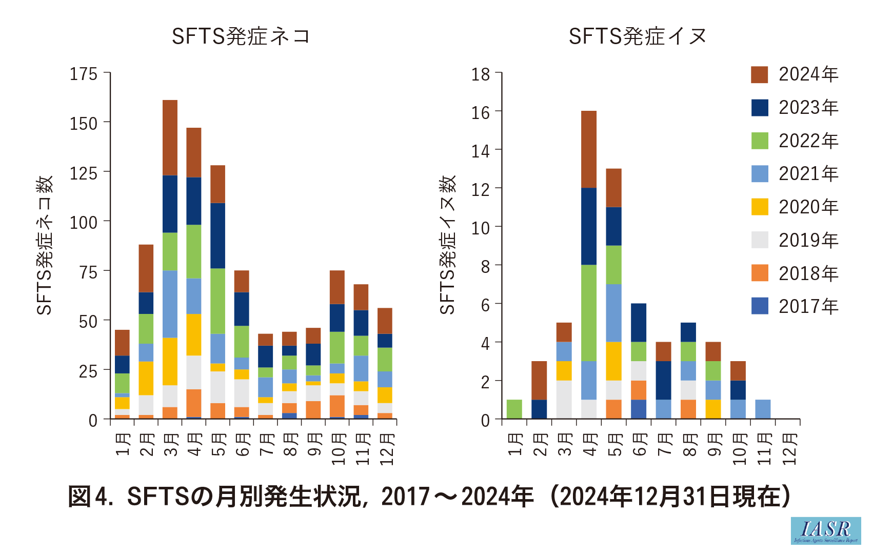 イヌにおけるSFTS発生数はネコに比べて少なく, 2024年は12頭であった(図2)。報告数は2017年以降, 増加傾向にある。発生報告は西日本に多いが, ネコで発生のない長野県や富山県からも報告されている。長野県の例では, SFTS流行地から長野県のボランティアに譲渡されたイヌが発症した。イヌでの発生は4月と5月に多く, 冬季の発生は少ない(図4)。イヌでの発生時期はヒトの場合と似ている。
