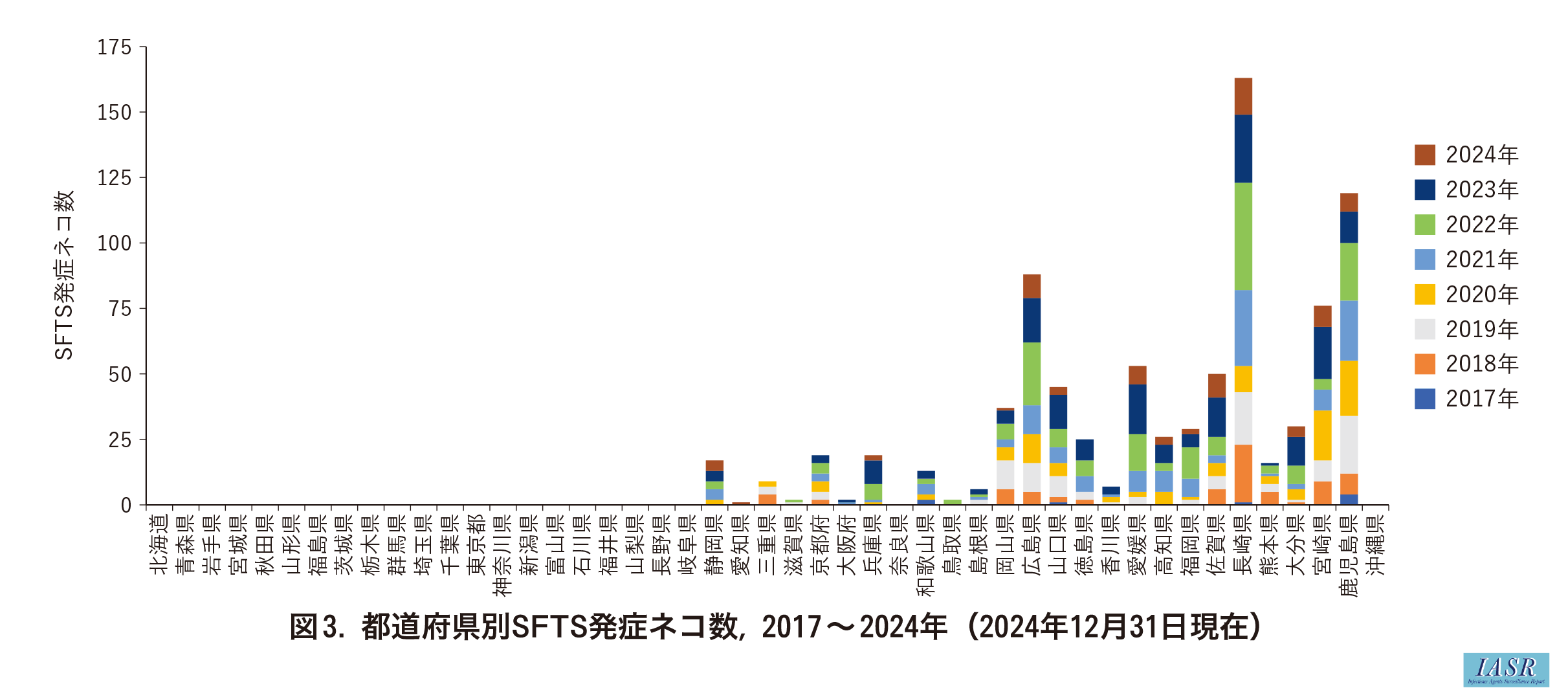 愛玩動物におけるSFTSV診断ネットワークにより収集している2017年以降のSFTS発症ネコの報告数は増加しており, 2024年は196頭報告された(図2)。その数はヒト患者数が2024年122名であるのに対し, 1.6倍となっている。ネコにおけるSFTS発生は西日本が中心で, 長崎県(171頭), 鹿児島県(127頭), 広島県(100頭)で多くの発生が報告されている(図3)。一方, 発生数は少ないが, 日本海側では石川県, 太平洋側では静岡県で報告されている。石川県, 福井県, 愛知県, 奈良県では2024年になって初めて報告された。沖縄県での報告はまだない。SFTS発症ネコが報告されている地域はSFTS患者発生地とほぼ一致している。現在, SFTS発生地域は東日本へと拡大している。ネコにおけるSFTS発生は3~5月にかけて多いが, 冬季にも報告がある(図4)。