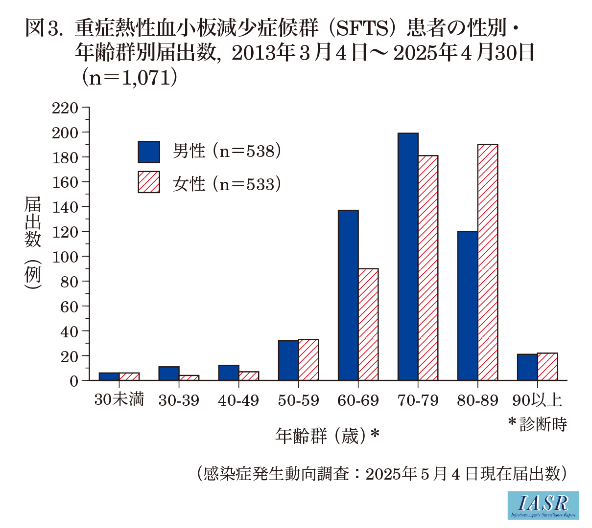 2013年3月~2025年4月末までに感染症発生動向調査に届出された国内症例は1,071例で, 男女比はほぼ同等(表, 本号3ページ)。年齢中央値は75歳で, 60歳以上が90%を占める(図3)。2016年までは年間60例前後で推移していたが, 2017年以降は増加傾向となり, 2023年には134例が届け出された。感染経路はマダニまたは愛玩動物などからの感染が多く, 農作業や山林での活動が感染のリスク要因とされ, 感染予防策の徹底が求められている。