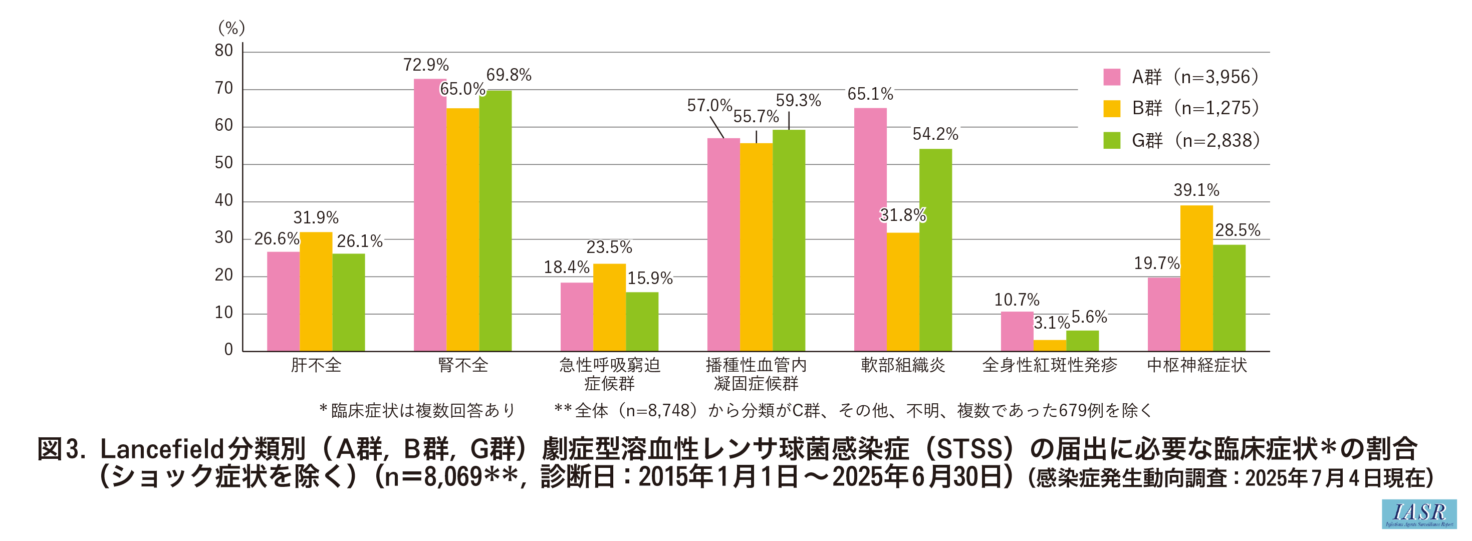 高齢者に多い疾患であるが, 新生児から乳児期(生後0か月64例, 1~3か月38例, 4~11か月6例)の届出もなされている。届出数は, 2015年以降, 毎年増加傾向である(図1)。届出に必要な臨床症状では, A群, G群に比べて軟部組織炎を呈する割合が少なく, 中枢神経症状を呈する割合が高い傾向を認めた(特に0歳:軟部組織炎11%, 中枢神経症状70%)(図3)。