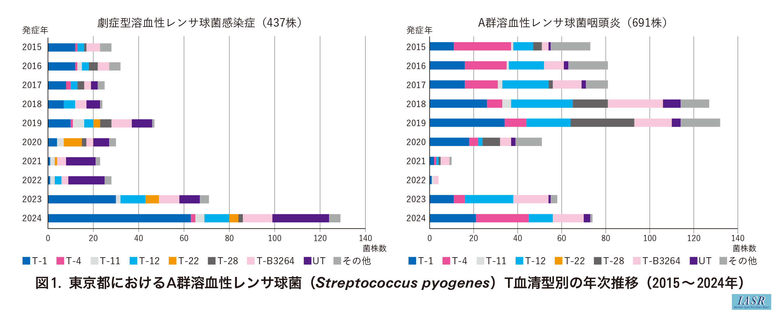 劇症型由来株では, T-1型が延べ148/437株(33.9%), T-B3264型が60/437株(13.7%), T-12型が43/437株(9.8%)などの順で多かった。一方, 咽頭炎由来株はT-1型が156/691株(22.6%), T-12型が130/691株(18.8%), T-4型が111/691株(16.1%), T-B3264型が108/691株(15.6%), などの順で多く, 発症年別でも劇症型と咽頭炎由来株ではT血清型別で違いがみられた(図1)。