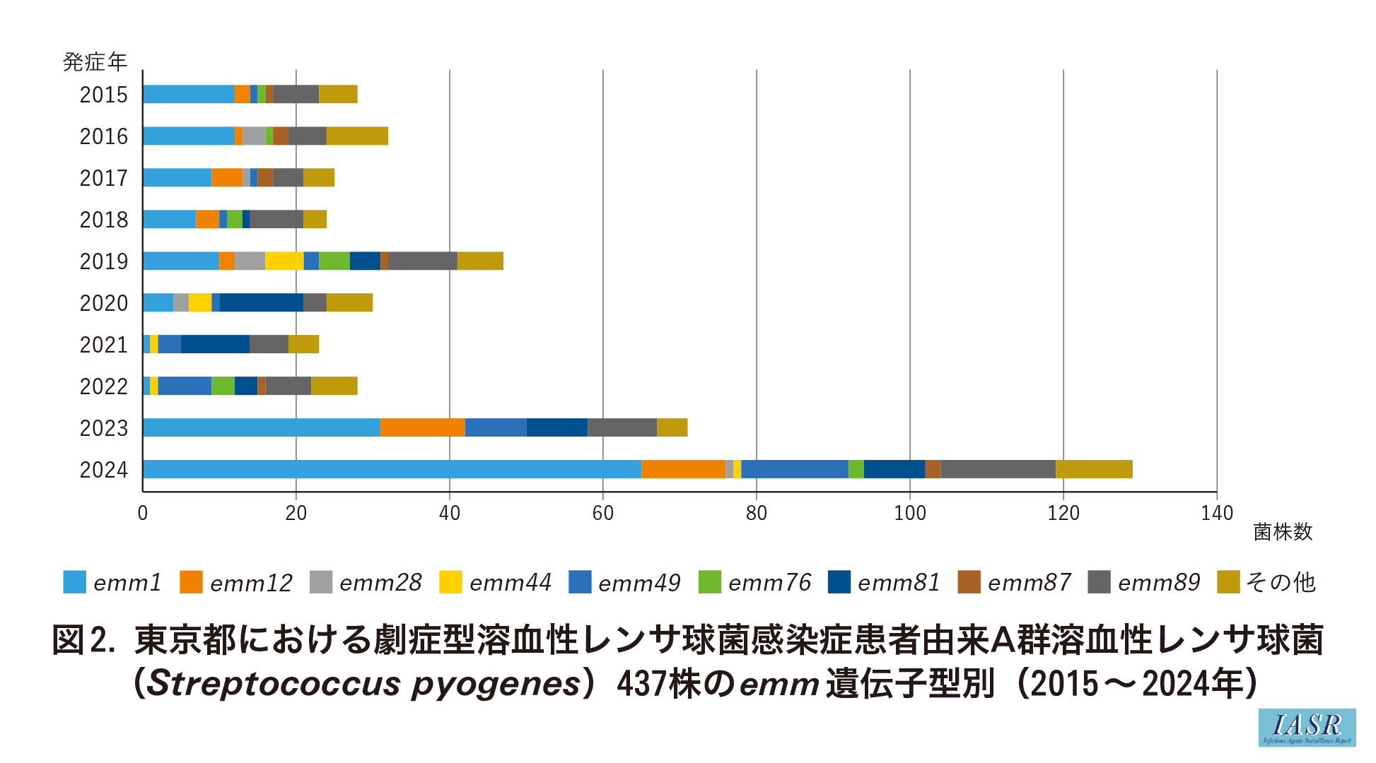 劇症型由来株についてemm遺伝子型別を実施した結果, emm1型が152/437株(34.8%)と最も多く, 次いでemm89型が69/437株(15.8%), emm81型が44/437株(10.1%)などと続き, 特に2023年, 2024年はemm1型が占める割合が多い傾向があった(図2)。