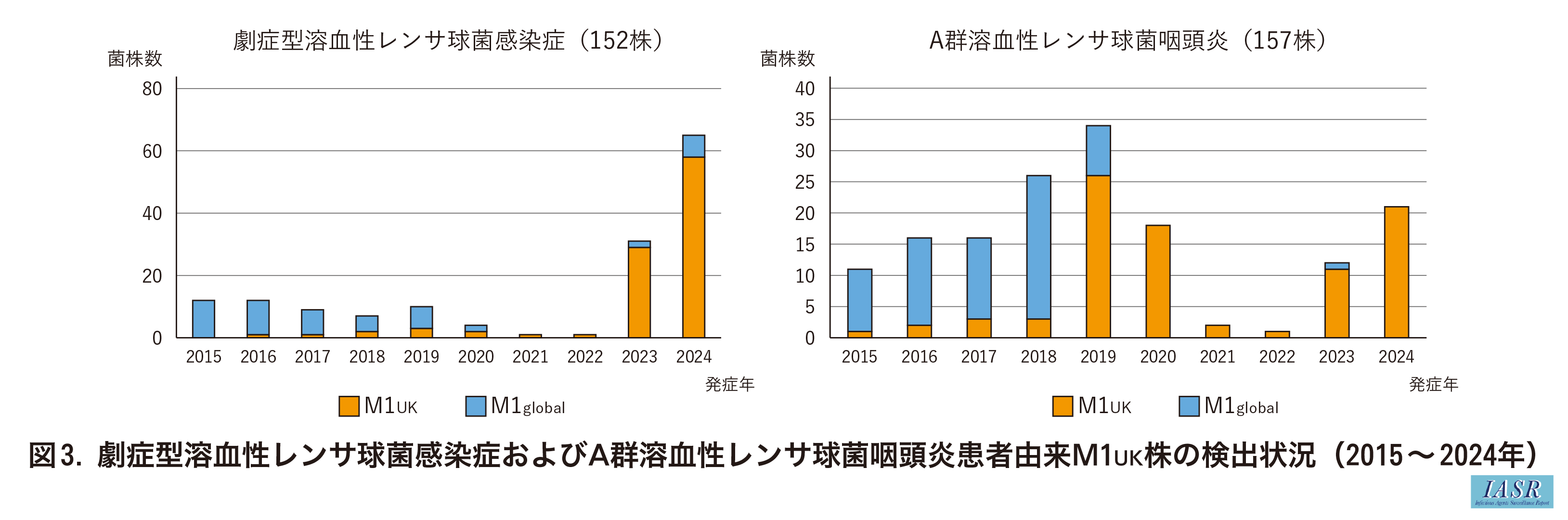 2024年1月の厚生労働省通知(感感発0117第5号)によりM1UK株の検出法が提示されたことを踏まえ, 当センターで確保したemm1型株(劇症型由来152株, 咽頭炎由来157株)についてM1UK株の検査を実施した。その結果, 劇症型由来株は98/152株(64.5%), 咽頭炎由来株では88/157株(56.1%)がM1UK株であった(図3)。特に, 2023~2024年の劇症型由来株中のM1UK株の割合をみると, それぞれ29/31株(93.5%), 58/65株(89.2%)であった。一方, 咽頭炎由来株では, 2019年は26/34株(76.5%), 2023年は11/12株(91.7%)が検出され, 2020~2022年および2024年は, 検査に供したemm1型のすべてがM1UK株であった(図3)。