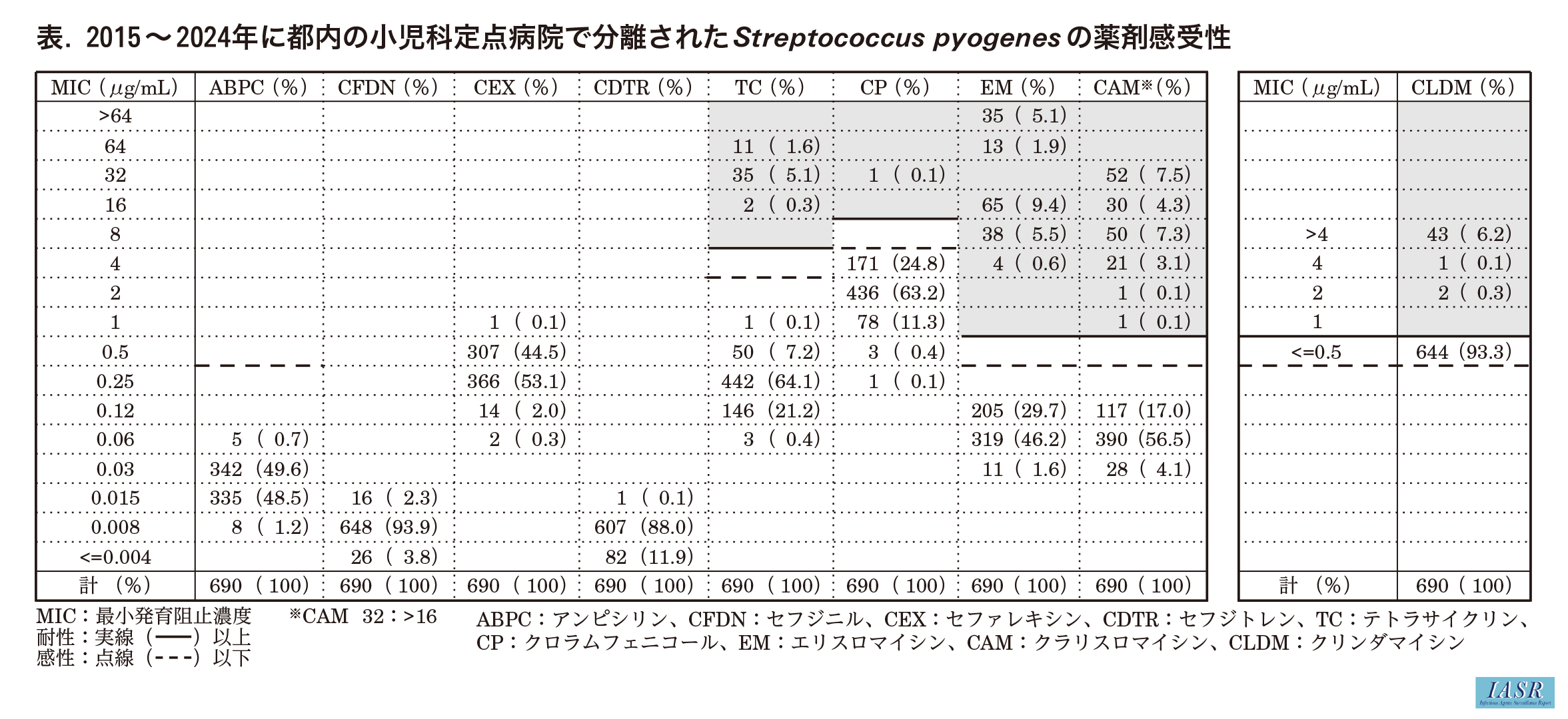 咽頭炎由来株について, 発育不良であった1株を除いた690株を対象に, 9薬剤(アンピシリン:ABPC, セフジニル:CFDN, セファレキシン:CEX, セフジトレン:CDTR, テトラサイクリン:TC, クロラムフェニコール:CP, エリスロマイシン:EM, クラリスロマイシン:CAM, クリンダマイシン:CLDM)を含むドライプレート(オーダープレートTNE4)を用い, IA40 MIC(栄研化学)により薬剤感受性試験を実施した(表)。その結果, β-ラクタム系抗菌薬4剤(ABPC, CFDN, CEX, CDTR)については, すべてが良好な感受性を示した。耐性株がみられた5薬剤の耐性率は, TC:7.0%, CP:0.1%, EMおよびCAMが22.5%, CLDM:6.7%であった(表)。M1UK株については, TC, EM, CAMの3剤耐性株が1株(1.1%:1/88株)みられたのみであった。