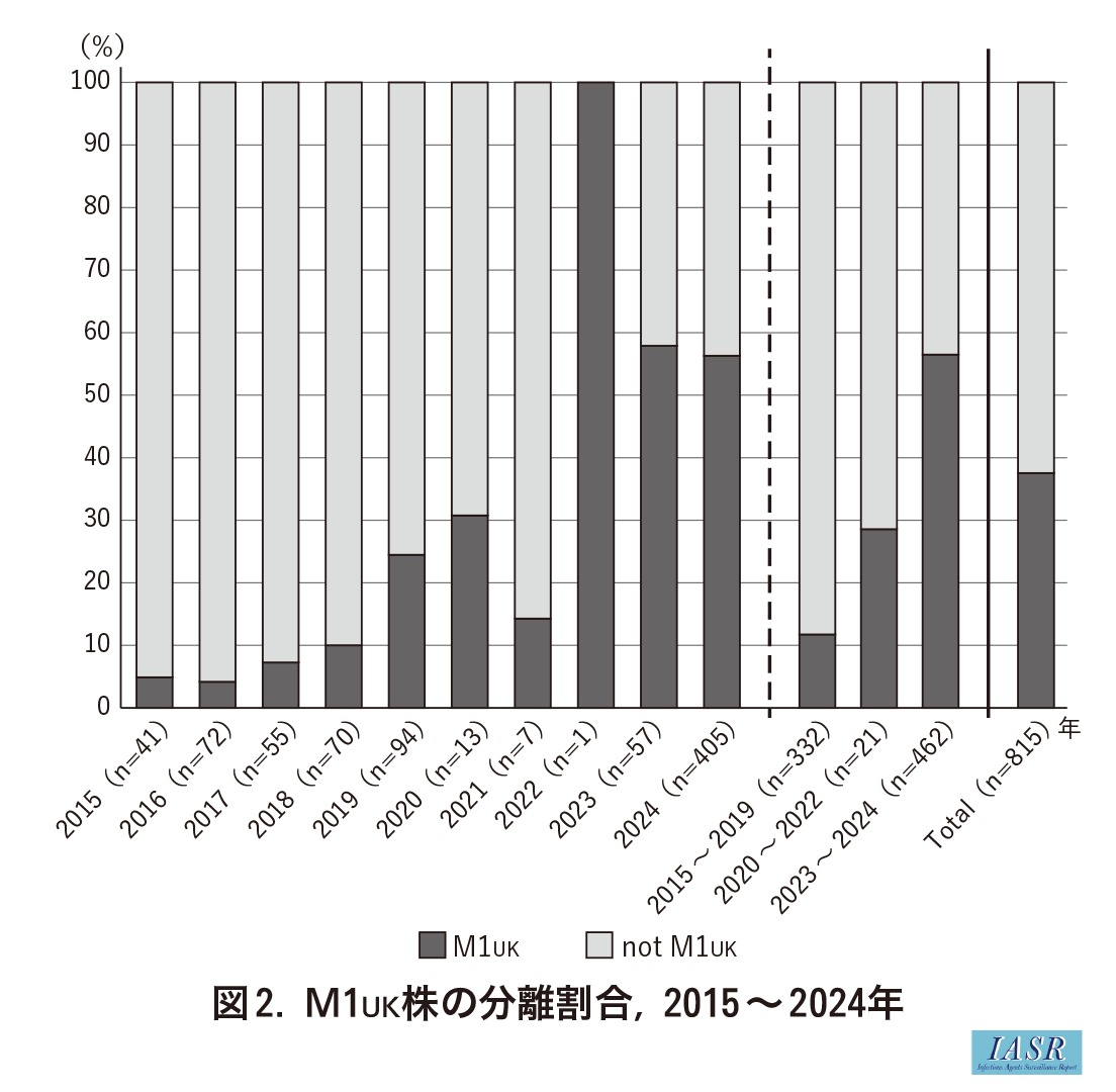 近年, M1UK株と呼ばれる変異型菌株の拡大が国際的に注目されている。この株は従来のemm1型と比較し, 発赤毒素SPE-Aの産生量が約9倍多く, 伝播性が顕著に高い特徴を持っている。2015~2024年に収集したemm1型株815株についてM1UK株の分離割合を調べた(図2)。emm1型815株中37.5%(306株)でM1UK株であった。各年の分離割合は, 2015年4.9%(2株), 2016年4.2%(3株), 2017年7.3%(4株), 2018年10.0%(7株), 2019年24.5%(23株), 2020年30.8%(4株), 2021年14.3%(1株), 2022年100%(1株), 2023年57.9%(33株), 2024年56.3%(228株)であり, 分離数の少なかった2020~2022年を除くと, 分離割合は増加傾向であった。特に, 2023年, 2024年は50%を超えていた。2019年以前のCOVID-19流行前とマスクの着用が個人の判断となった2023年以降を比較すると, M1UK株の分離割合は11.7%から56.5%に上昇していた。